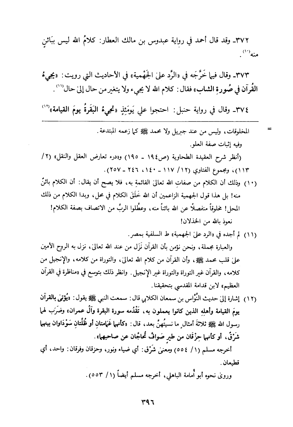 ٣٧٤ - وَقَالَ فِي رواية حنبل: احتجوا علي يومئذ " تجئ البقرة يوم القيامة "، "