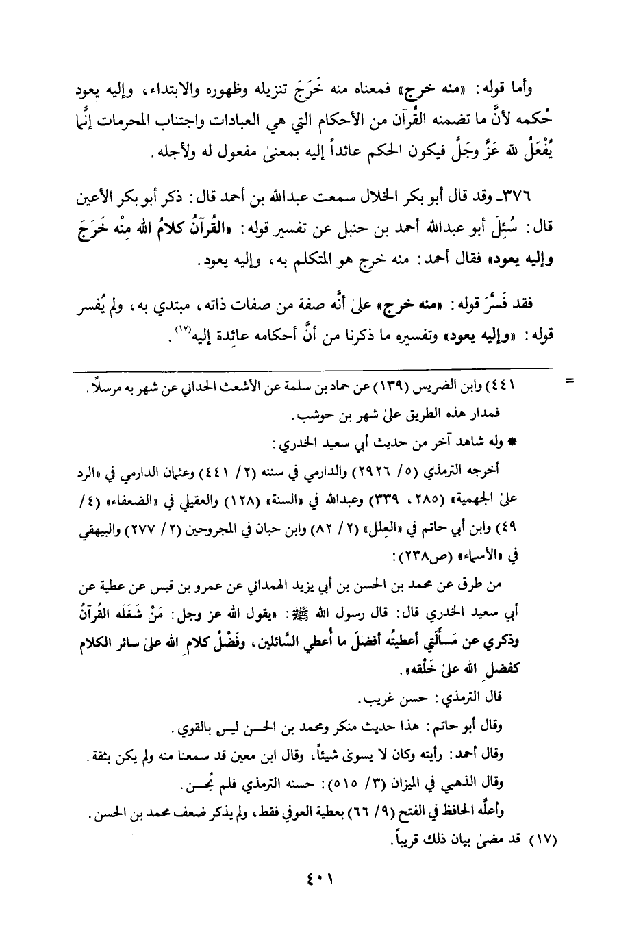 ٣٧٦ - وقد قَالَ أَبُو بكر الخلال: سمعت عبد اللَّه بْن أحمد قَالَ: ذكر أَبُو بكر الأعين قَالَ: سئل أَبُو عبد اللَّه أحمد بْن حنبل عَن تفسير قوله: " القرآن كلام اللَّه مِنْهُ خرج وإليه يعود "، فَقَالَ أحمد: مِنْهُ خرج هُوَ المتكلم به، وإليه يعود فقد فسر قوله: " مِنْهُ خرج " عَلَى أَنَّهُ صفة من صفات ذاته، مبتدي به، ولم يفسر قوله: " وإليه يعود " وتفسيره مَا ذكرنا من أن أحكامه عائدة إِلَيْهِ
