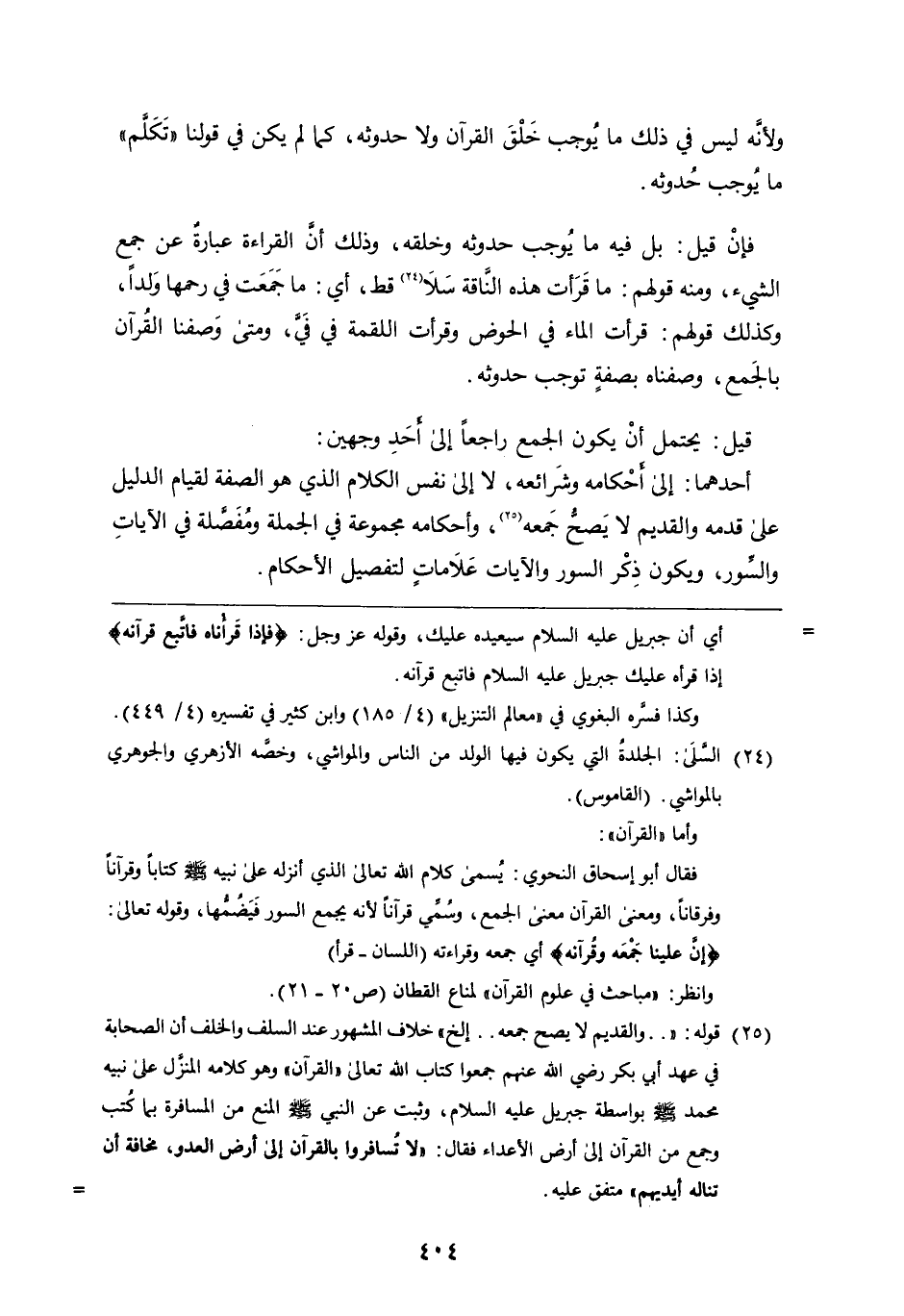 ولأنه ليس فِي ذلك مَا يوجب خلق القرآن وَلا حدوثه، كَمَا لَمْ يكن فِي قولنا تكلم مَا يوجب حدوثه فإن قِيلَ: بل فِيهِ مَا يوجب حدوثه وخلقه، وذلك أن القراءة عبارة عَن جمع الشيء، وَمِنْهُ قولهم: مَا قرأت هَذِهِ