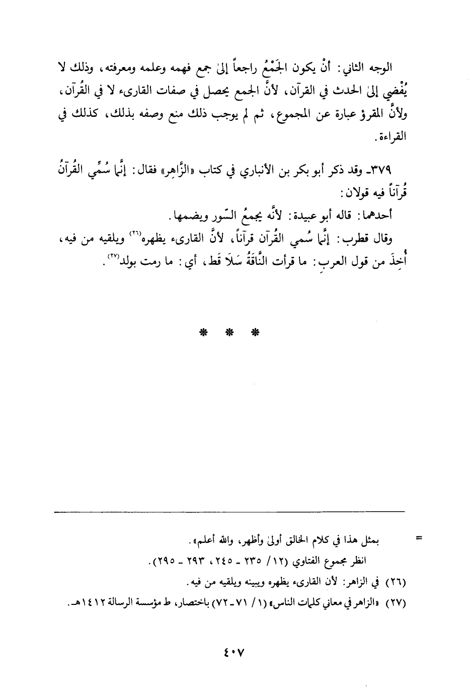٣٧٩ - وَقَدْ ذَكَرَ أَبُو بكر بْن الأنباري فِي كتاب الزاهر فَقَالَ: إنما سمي القرآن قرآنا فِيهِ قولان: أحدهما: قاله أَبُو عبيدة: لأَنَّهُ يجمع السور ويضمها وقال قطرب: إنما سمي القرآن قرآنا لأَنَّ القارئ يظهره ويلقيه من فِيهِ، أخذ من قول العرب: مَا قرأت الناقة سلا قط، أي: مَا رمت بولد