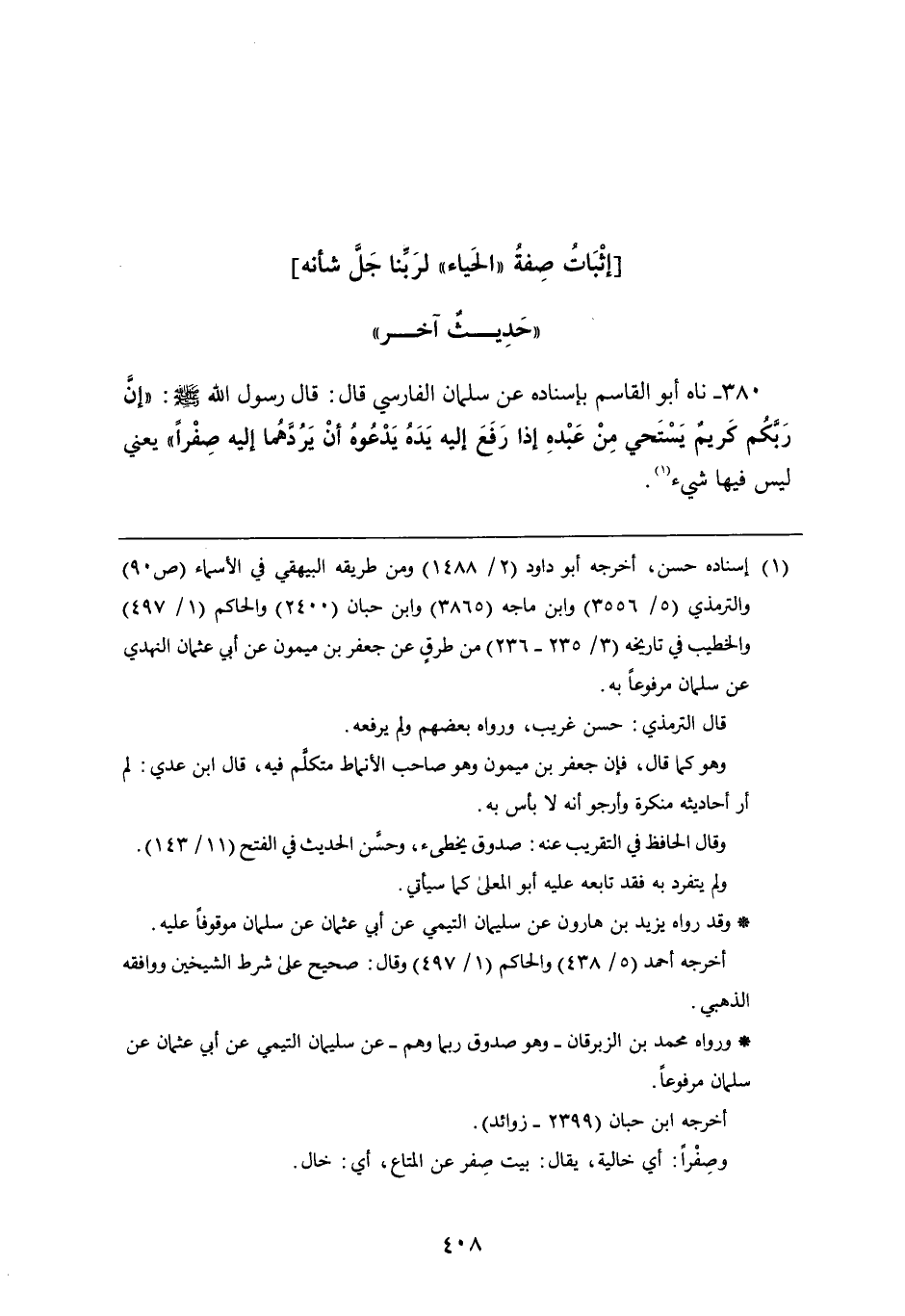 ٣٨٠ - ناه أَبُو الْقَاسِم بِإِسْنَادِهِ، عَن سلمان الفارسي قَالَ: قَالَ رَسُول اللَّهِ صَلَّى اللَّهُ عَلَيْهِ وَسَلَّمَ: " إن ربكم كريم يستحي من عبده إِذَا رفع إِلَيْهِ يده يدعوه أن يردهما إِلَيْهِ صفرا " يَعْنِي ليس فيها شيء