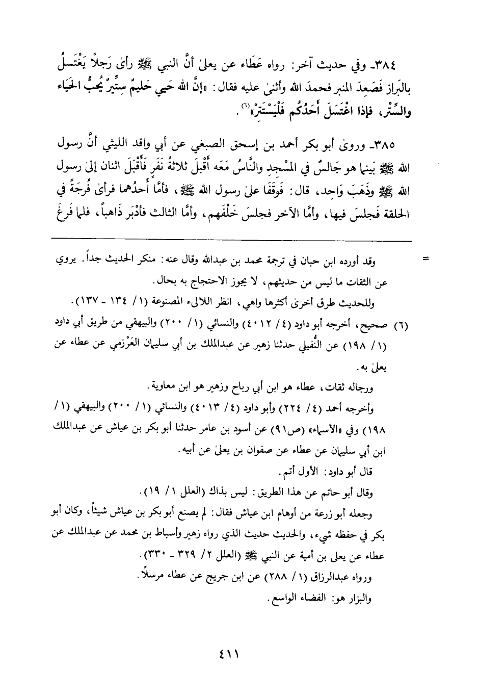 ٣٨٤ - وَفِي حديث آخر: رَوَاهُ عطاء، عَن يعلى، أَنَّ النَّبِيَّ صلى اللَّه رأى رجلا يغتسل بالبراز فصعد المنبر فحمد اللَّه وأثنى عَلَيْهِ، فَقَالَ: "
