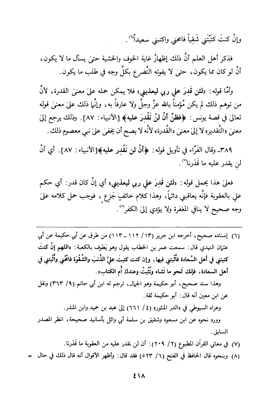 ٣٨٩ - وَقَالَ الفراء فِي تأويل قوله: {أَنْ لَنْ نَقْدِرَ عَلَيْهِ} أي أن لَنْ يقدر عَلَيْهِ مَا قدرنا فعلى هَذَا يحمل قوله: " لئن قدر علي ربي ليعذبني " أي إن كان قدر: أي حكم علي بالعقوبة فإنه يعاقبني دائما، وَهَذَا كلام خائف جزع، فوجب حمل كلامه عَلَى وجه صحيح لا ينافي المغفرة وَلا يؤدي إِلَى الكفر