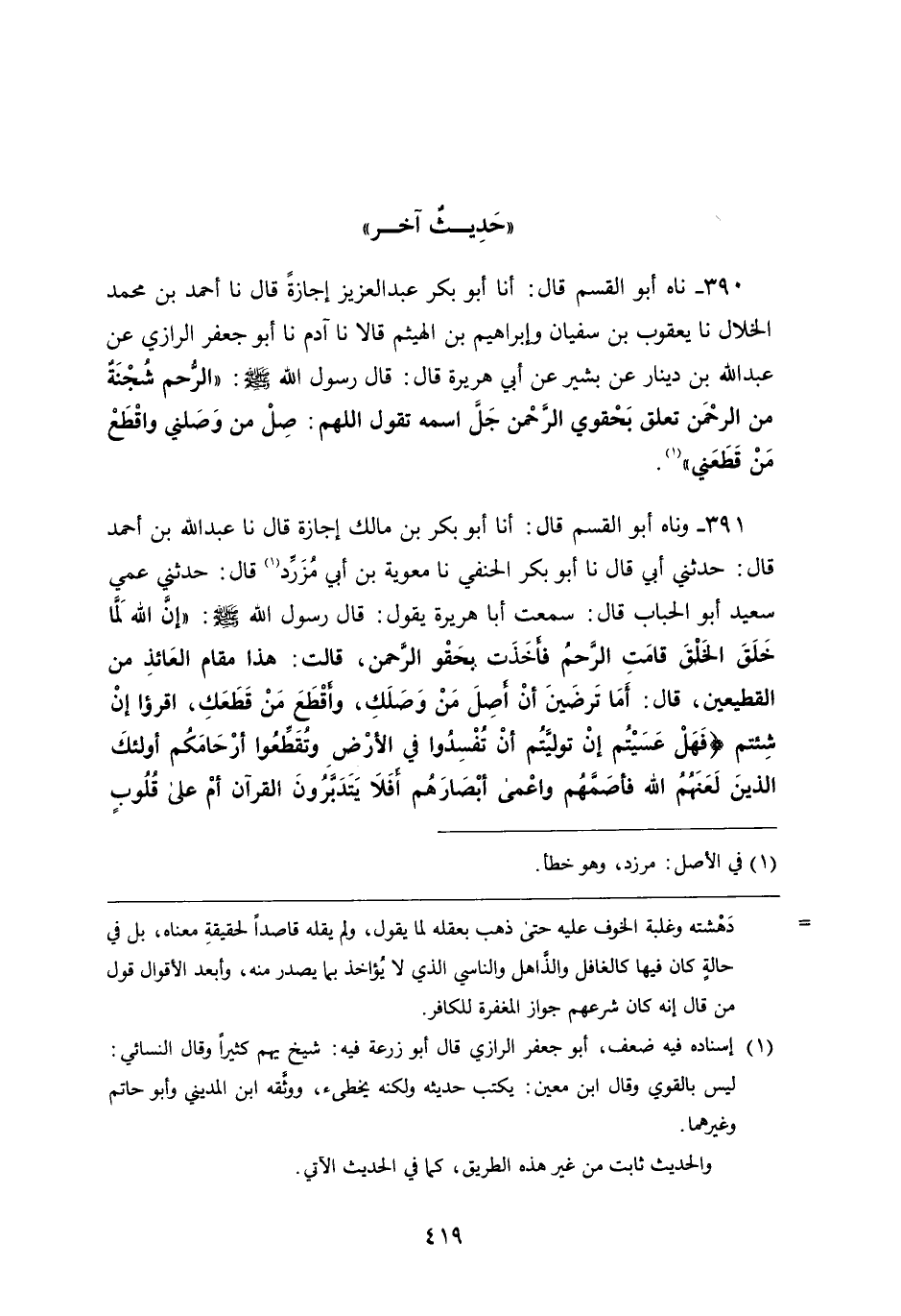 ٣٩٠ - ناه أَبُو الْقَاسِمِ قَالَ: أنا أَبُو بَكْرٍ عَبْدُ الْعَزِيزِ إِجَازَةً، قَالَ: نا أَحْمَدُ بْنُ مُحَمَّدٍ الْخَلالُ، نا يَعْقُوبُ بْنُ سُفْيَانَ، وَإِبْرَاهِيمُ بْنُ الْهَيْثَمِ قَالا: نا آدَمُ، نا أَبُو جَعْفَرٍ الرَّازِيُّ، عَنْ عَبْدِ اللَّهِ بْنِ دِينَارٍ، عَنْ بَشِيرٍ، عَنْ أَبِي هُرَيْرَةَ قَالَ: قَالَ رَسُولُ اللَّهِ صَلَّى اللَّهُ عَلَيْهِ وَسَلَّمَ: " الرَّحِمُ شُجْنَةٌ مِنَ الرَّحْمَنِ تَعَلَّقُ بِحَقْوَيِ الرَّحْمَنِ جَلَّ اسْمُهُ تَقُولُ: اللَّهُمَّ صِلْ مَنْ وَصَلَنِي وَاقْطَعْ مَنْ قَطَعَنِي "