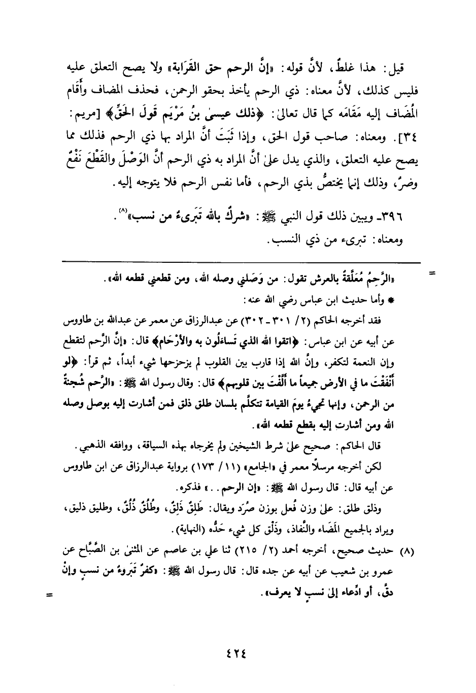 ٣٩٦ - ويبين ذلك قول النبي صَلَّى اللَّهُ عَلَيْهِ وَسَلَّمَ: " شرك بالله تبرئ من نسب " ومعناه: تبرئ من ذي النسب