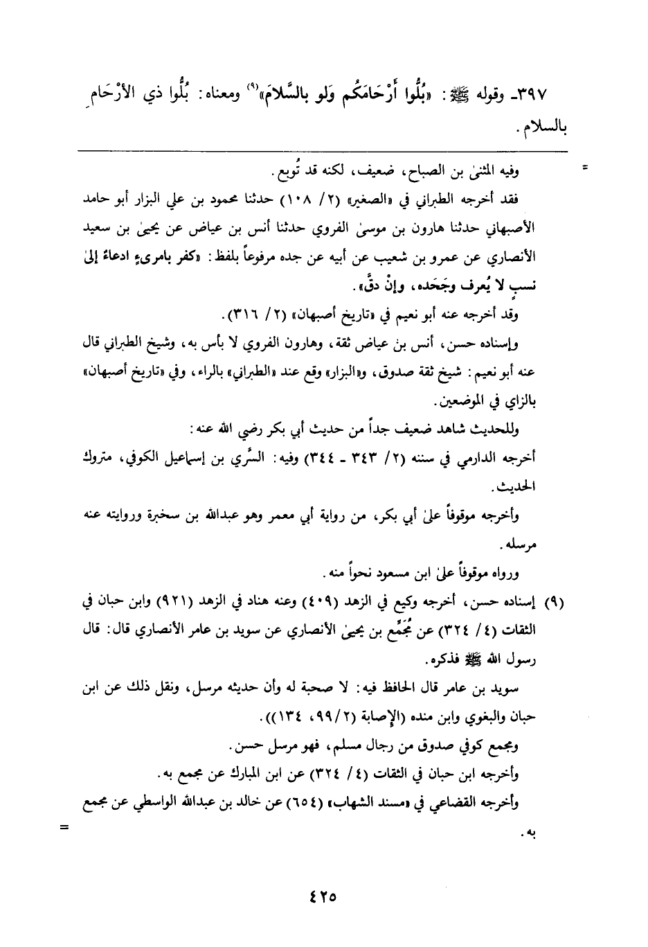 ٣٩٧ - وقوله صَلَّى اللَّهُ عَلَيْهِ وَسَلَّمَ: " بلوا أرحامكم ولو بالسلام " ومعناه: بلوا ذي الأرحام بالسلام