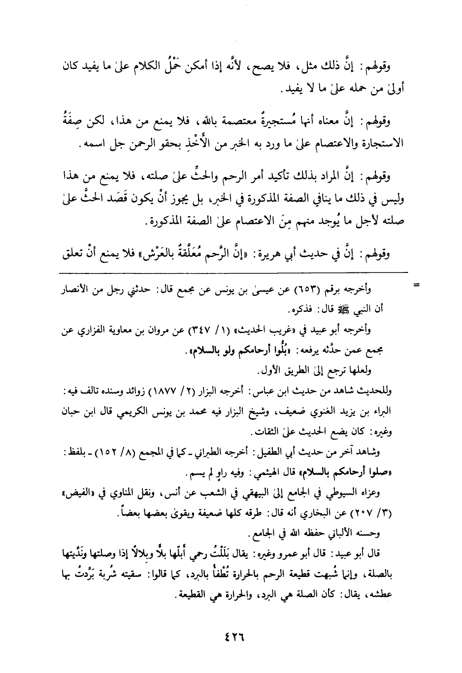 : إن معناه أنها مستجيرة معتصمة بالله، فلا يمنع من هَذَا، لكن صفة الاستجارة والاعتصام عَلَى مَا ورد به الخبر من الأخذ بحقو الرَّحْمَنِ جل اسمه وقولهم: إن المراد بذلك تأكيد أمر الرحم والحث عَلَى صلته، فلا يمنع من هَذَا، وليس فِي ذلك مَا ينافي الصفة المذكورة فِي الخبر، بل يجوز أَنْ يَكُونَ قصد الحث عَلَى صلته لأجل مَا يوجب منهم من الاعتصام عَلَى الصفة المذكورة وقولهم: إن فِي حديث أَبِي هريرة: " إن الرحم معلقة بالعرش " فلا يمنع أن تعلق