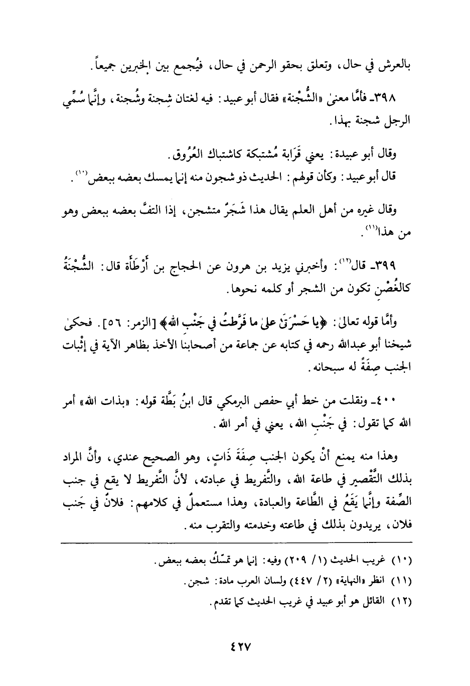 ٣٩٩ - قَالَ: وأخبرني يزيد بْن هارون، عَن الحجاج بْن أرطأة قَالَ: الشجنة كالغصن تكون من الشجر أو كلمه نحوها وأما قوله تَعَالَى: {يَا حَسْرَتَى عَلَى مَا فَرَّطْتُ فِي جَنْبِ اللَّهِ} فحكى شيخنا أَبُو عبد اللَّه رحمه فِي كتابه عَن جماعة من أصحابنا الأخذ بظاهر الآية فِي إثبات الجنب صفة