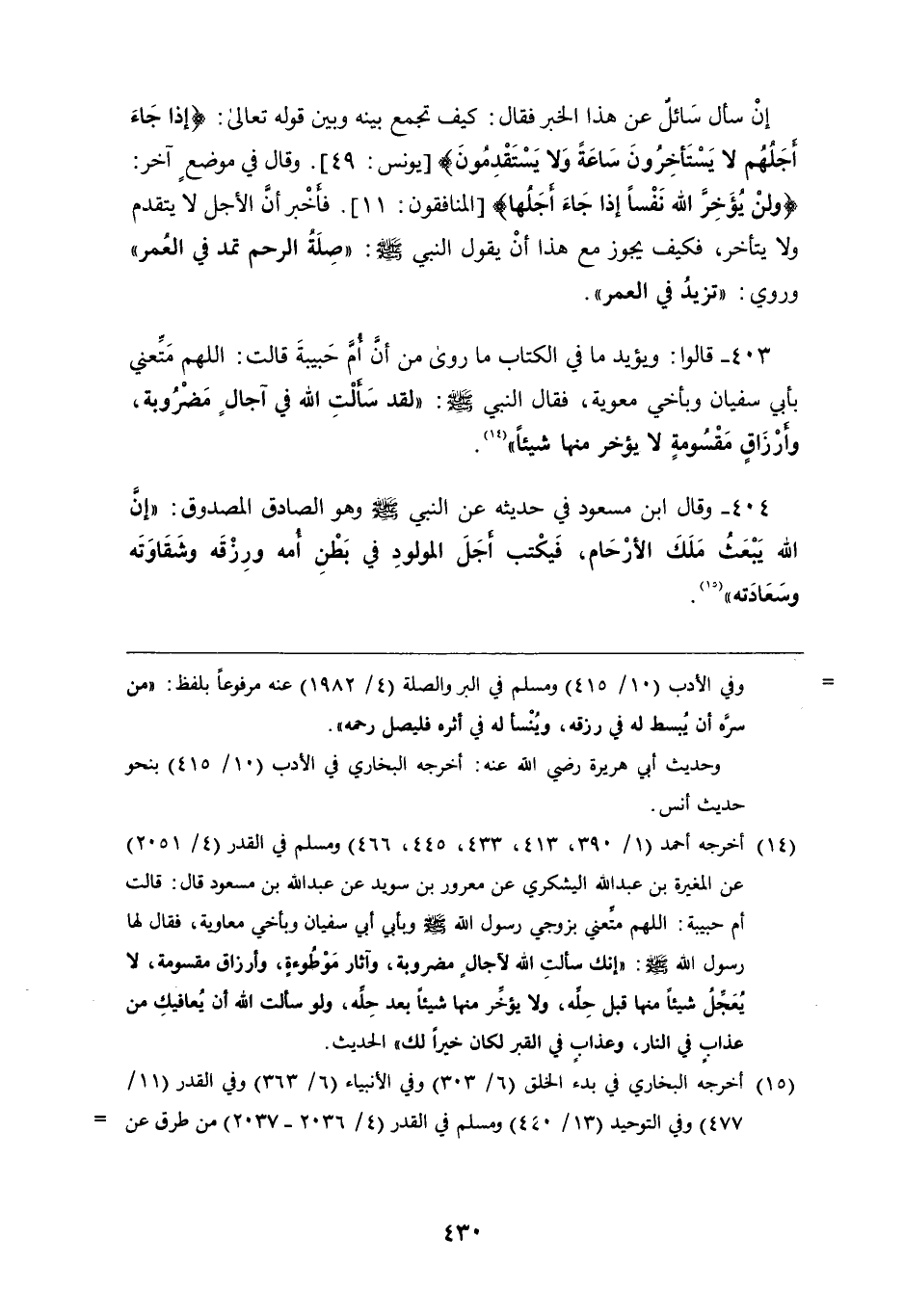 ٤٠٣ - قالوا: ويؤيد مَا فِي الكتاب مَا رَوَى من أن أم حبيبة قالت: اللهم متعني بأبي سفيان وبأخي معوية، فَقَالَ النبي صَلَّى اللَّهُ عَلَيْهِ وَسَلَّمَ: " لقد سألت اللَّه فِي آجال مضروبة، وأرزاق مقسومة لا يؤخر منها شيئا "