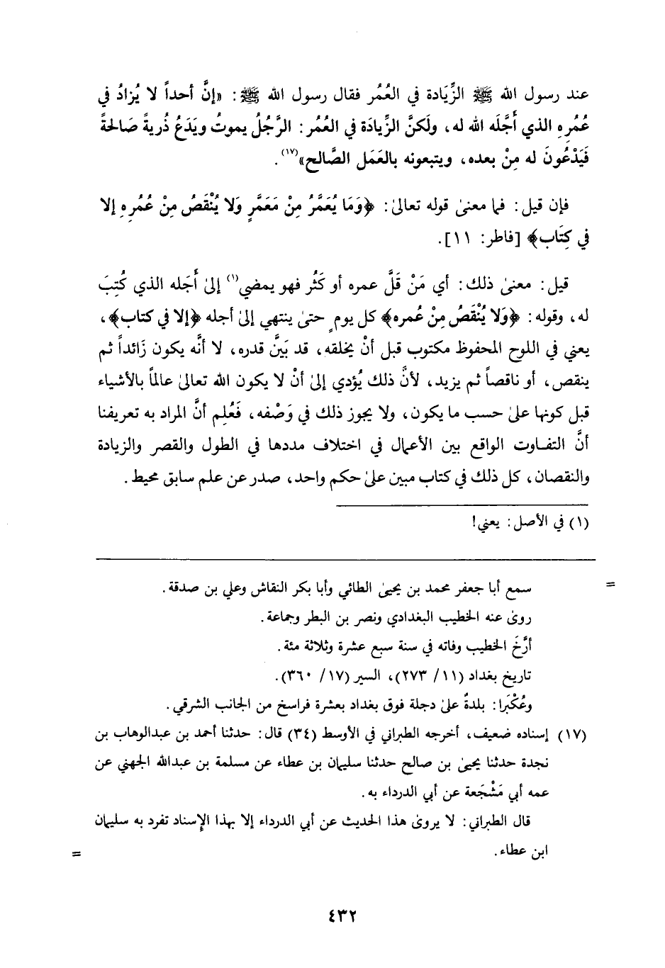 ثُمَّ ينقص، أو ناقصا ثُمَّ يزيد، لأَنَّ ذلك يؤدي إِلَى أن لا يكون اللَّه تَعَالَى عالما بالأشياء قبل كونها عَلَى حسب مَا يكون، وَلا يجوز ذلك فِي وصفه، فعلم أن المراد به تعريفنا أن التفاوت الواقع بين الأعمال فِي اختلاف مددها فِي الطول والقصر والزيادة والنقصان، كل ذلك فِي كتاب مبين عَلَى حكم واحد، صدر عَن علم سابق محيط