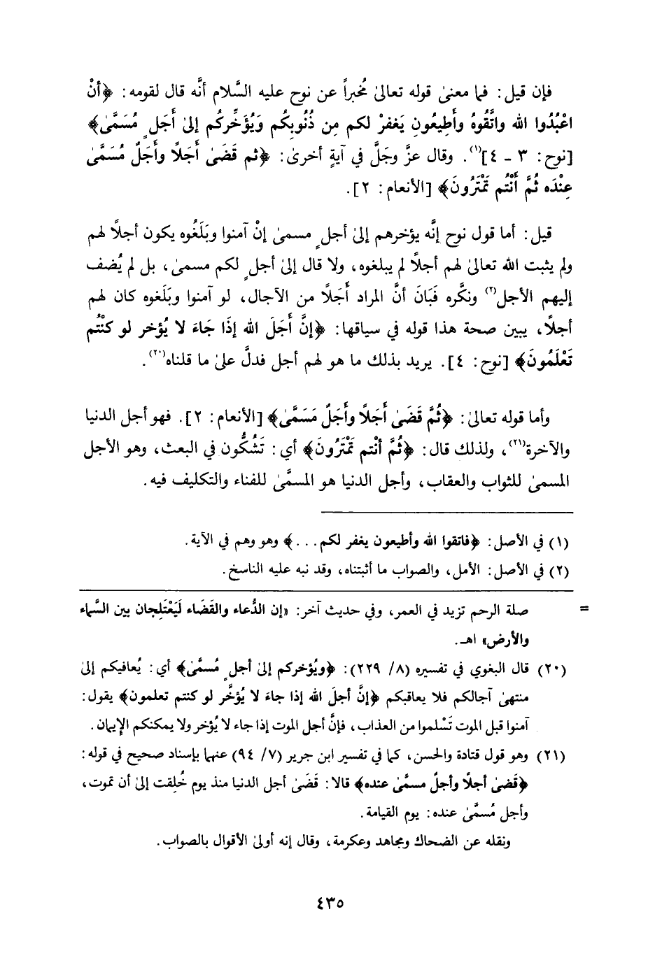 فإن قِيلَ: فما مَعْنَى قوله تَعَالَى مخبرا عَن نوح عَلَيْهِ السلام أَنَّهُ قَالَ لقومه: أَنِ اعْبُدُوا اللَّهَ وَاتَّقُوهُ وَأَطِيعُونِ يَغْفِرْ لَكُمْ مِنْ ذُنُوبِكُمْ وَيُؤَخِّرْكُمْ إِلَى أَجَلٍ مُسَمًّى سورة نوح آية - وَقَالَ عَزَّ وَجَلَّ فِي آية أخرى: ثُمَّ قَضَى أَجَلا وَأَجَلٌ مُسَمًّى عِنْدَهُ ثُمَّ أَنْتُمْ تَمْتَرُونَ سورة الأنعام آية قيل: أما قول نوح إنه يؤخرهم إِلَى أجل مسمى إن آمنوا وبلغوه يكون أجلا لهم، ولم يثبت اللَّه تَعَالَى لهم أجلا لَمْ يبلغوه، وَلا قَالَ إِلَى أجل مسمى، بل لَمْ يضف إليهم الأجل ونكره فبان أن المراد أجلا من الآجال، لو آمنوا وبلغوه كان لهم أجلا، يبين صحة هَذَا قوله فِي سياقها:
