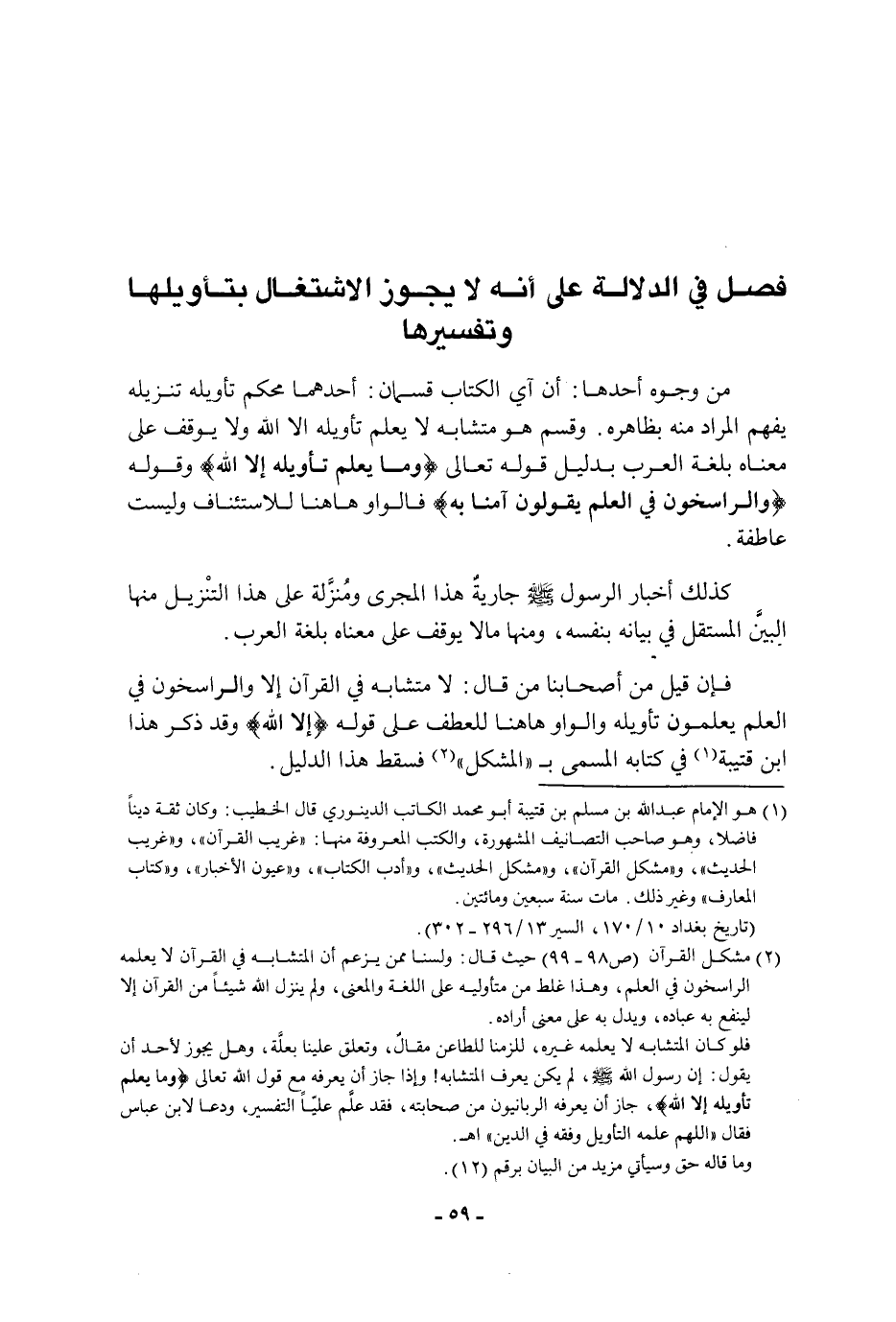 مِنْ وُجُوهٍ أَحَدُهَا: أَنَّ آيَ الْكِتَابِ قِسْمَانِ: أَحَدُهُمَا مُحْكَمٌ تَأْوِيلُهُ تَنْزِيلُهُ يُفْهَمُ الْمُرَادُ مِنْهُ بِظَاهِرِهِ وَقِسْمٌ هُوَ مُتَشَابِهٌ لا يَعْلَمُ تَأْوِيلَهُ إِلا اللَّهُ وَلا يُوقَفُ عَلَى مَعْنَاهُ بِلُغَةِ الْعَرَبِ بِدَلِيلِ قَوْلِهِ تَعَالَى: {وَمَا يَعْلَمُ تَأْوِيلَهُ إِلا اللَّهُ} وَقَوْلِهِ: {وَالرَّاسِخُونَ فِي الْعِلْمِ يَقُولُونَ آمَنَّا بِهِ} فَالْوَاوُ هَهُنَا لِلاسْتِئْنَافِ وَلَيْسَتْ عَاطِفَةً كَذَلِكَ أَخْبَارُ الرَّسُولِ، صَلَّى اللَّهُ عَلَيْهِ وَسَلَّمَ، جَارِيَةٌ هَذَا الْمَجْرَى وَمُنَزَّلَةٌ عَلَى هَذَا التَّنْزِيلِ مِنْهَا الْبَيِّنُ الْمُسْتَقِلُّ فِي بَيَانِهِ بِنَفْسِهِ، وَمِنْهَا مَا لا يُوقَفُ عَلَى مَعْنَاهُ بِلُغَةِ الْعَرَبِ فَإِنْ قِيلَ مِنْ أَصْحَابِنَا مَنْ قَالَ: لا مُتَشَابِهَ فِي الْقُرْآنِ إِلا وَالرَّاسِخُونَ فِي الْعِلْمِ يَعْلَمُونَ تَأْوِيلَهُ، وَالْوَاوُ هَهُنَا لِلْعَطْفِ عَلَى قَوْلِهِ: {إِلا اللَّهَ} وَقَدْ ذَكَر هَذَا ابْنُ قُتَيْبَةَ فِي كِتَابِهِ الْمُسَمَّى بِ الْمُشْكِلِ فَسَقَطَ هَذَا الدَّلِيلُ.