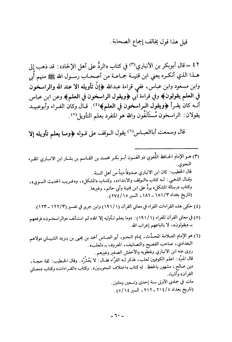 ٤٢ - قَالَ أَبُو بَكْرٍ الأَنْبَارِيُّ فِي كِتَابِ الرَّدِّ عَلَى أَهْلِ الإِلْحَادِ: قَدْ ذَهَبَ إِلَى هَذَا الَّذِي أَنْكَرَهُ يَعْنِي: ابْنَ قُتَيْبَةَ، جَمَاعَةٌ مِنْ أَصْحَابِ رَسُولِ اللَّهِ، صَلَّى اللَّهُ عَلَيْهِ وَسَلَّمَ، مِنْهُمْ أُبَيٌّ وَابْنُ مَسْعُودٍ وَابْنُ عَبَّاسٍ، فَفِي قِرَاءَةِ عَبْدِ اللَّهِ: إِنْ تَأْوِيلُهُ إِلا عِنْدَ اللَّهِ وَالرَّاسِخُونَ فِي الْعِلْمِ يَقُولُونَ، وَفِي قِرَاءَةِ أُبَيٍّ: وَيَقُولُ الرَّاسِخُونَ فِي الْعِلْمِ، وَعَنِ ابْنِ عَبَّاسٍ أَنَّهُ