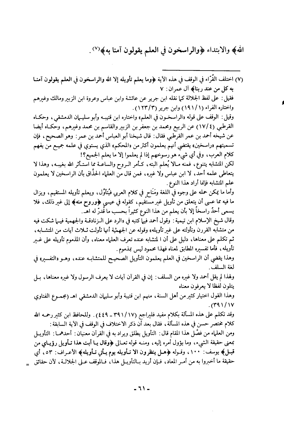 اللَّهُ} ، وَالابْتِدَاءُ {وَالرَّاسِخُونَ فِي الْعِلْمِ يَقُولُونَ آمَنَّا بِهِ}