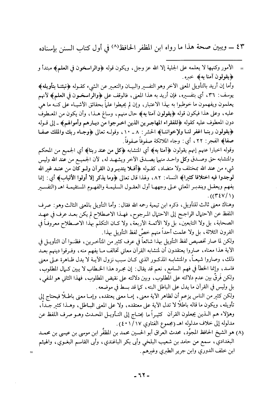 ٤٣ - وَيُبَيِّنُ صِحَّةَ هَذَا مَا رَوَاهُ ابْنُ الْمُظَفَّرِ الْحَافِظُ فِي أَوَّلِ كِتَابِ السُّنَنِ بِإِسْنَادِهِ،