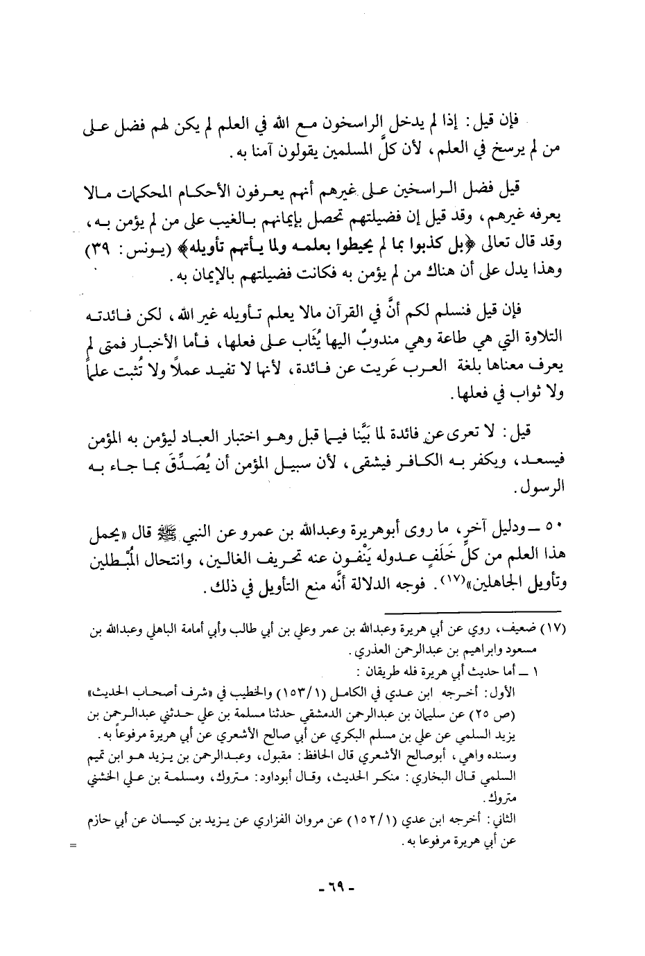 ٥٠ - ودليل آخر ما روى أَبُو هُرَيْرَةَ وعبد الله بن عمرو، عن النبي، صَلَّى اللَّهُ عَلَيْهِ وَسَلَّمَ، قَالَ: " يحمل هَذَا العلم من كل خلف عدوله ينفون عنه تحريف الغالين، وانتحال المبطلين وتأويل الجاهلين " فوجه الدلالة أنه منع التأويل فِي ذَلِكَ.