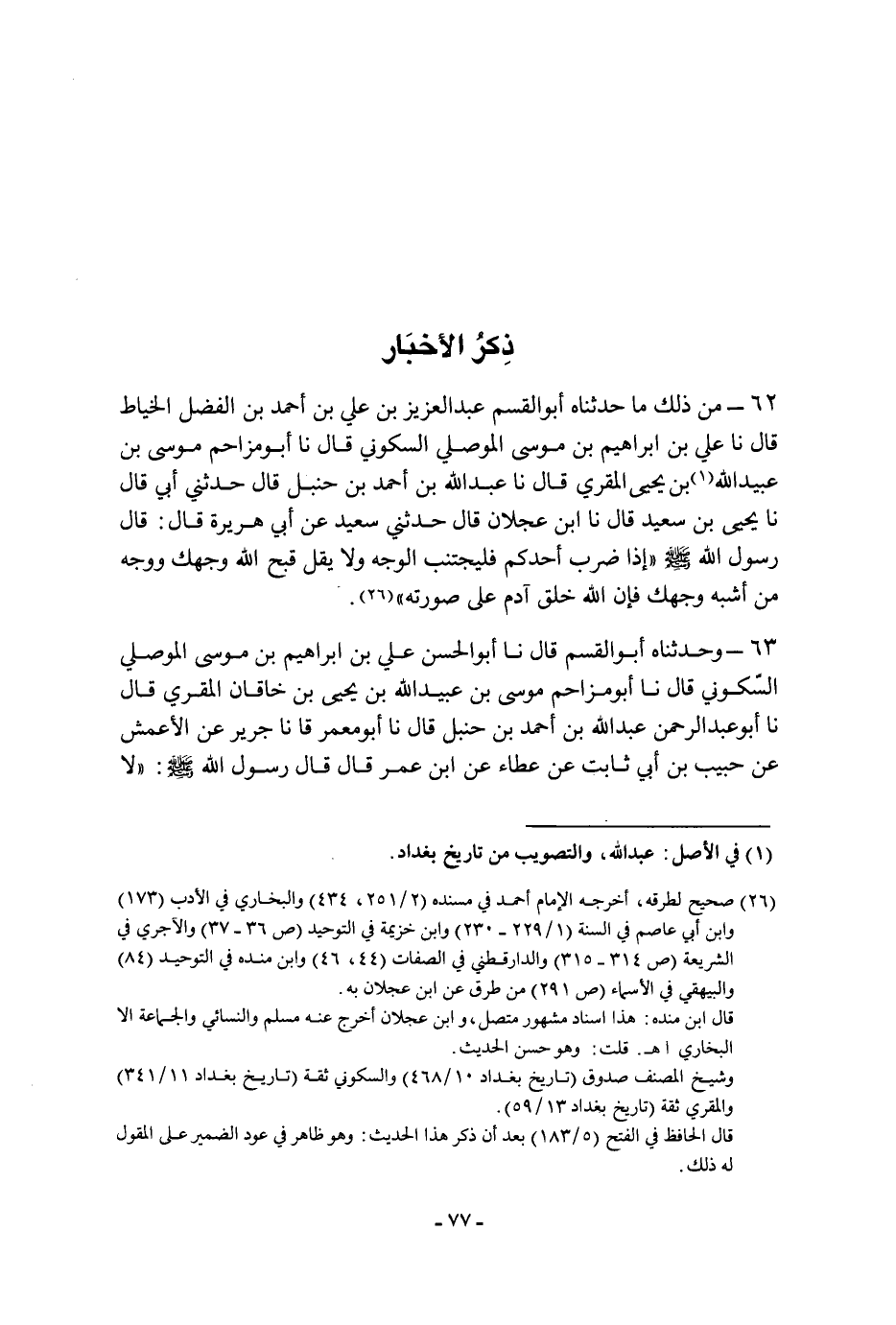 ٦٢ - مِنْ ذَلِكَ مَا حَدَّثَنَاهُ أَبُو الْقَاسِمِ عَبْدُ الْعَزِيزِ بْنُ عَلِيِّ بْنِ أَحْمَدَ بْنِ الْفَضْلِ الْخَيَّاطُ، قَالَ: نا عَلِيُّ بْنُ إِبْرَاهِيمَ بْنِ مُوسَى الْمَوْصِلِيُّ السَّكُونِيُّ، قَالَ: نا أَبُو مُزَاحِمٍ مُوسَى بْنُ عُبَيْدِ اللَّهِ بْنِ يَحْيَى الْمُقْرِئُ، قَالَ: نا عَبْدُ اللَّهِ بْنُ أَحْمَدَ بْنِ حَنْبَلٍ، قَالَ: حَدَّثَنِي أَبِي، قَالَ: نا يَحْيَى بْنُ سَعِيدٍ، قَالَ: نا ابْنُ عَجْلانَ، قَالَ: حَدَّثَنِي سَعِيدٌ، عَنْ أَبِي هُرَيْرَةَ، قَالَ: قَالَ رَسُولُ اللَّهِ، صَلَّى اللَّهُ عَلَيْهِ وَسَلَّمَ: " إِذَا ضَرَبَ أَحَدُكُمْ فَلْيَجْتَنِبِ الْوَجْهَ، وَلا يَقُلْ: قَبَّحَ اللَّهُ وَجْهَكَ وَوَجْهَ مَنْ أَشْبَهَ وَجْهَكَ، فَإِنَّ اللَّهَ خَلَقَ آدَمَ عَلَى صُورَتِهِ "