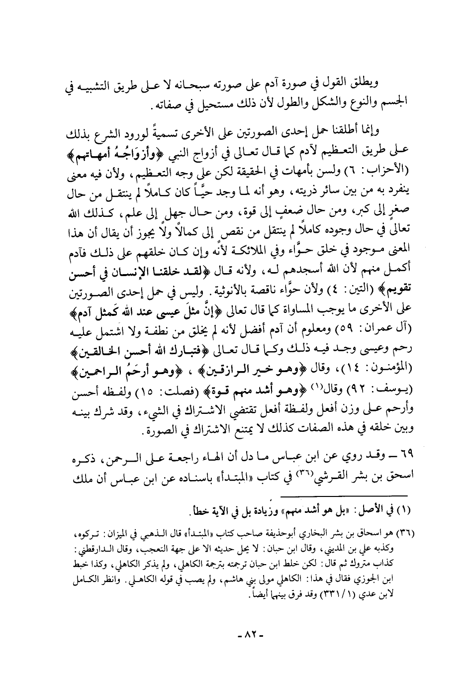 نقص إلى كمالا، ولا يجوز أن يقال أن هَذَا المعنى موجود فِي خلق حواء وفي الملائكة لأنه وإن كان خلقهم عَلَى ذَلِكَ فآدم أكمل منهم لأن الله أسجدهم له، ولأنه قَالَ: {لَقَدْ خَلَقْنَا الإِنْسَانَ فِي أَحْسَنِ تَقْوِيمٍ} ولأن حواء ناقصة بالأنوثية وليس فِي حمل إحدى الصورتين عَلَى الأخرى ما يوجب المساواة كما قَالَ تَعَالَى: {إِنَّ مَثَلَ عِيسَى عِنْدَ اللَّهِ كَمَثَلِ آدَمَ} ومعلوم أن آدم أفضل لأنه لم يخلق من نطفة، ولا اشتمل عليه رحم وعيسى وجد فِي ذَلِكَ، وكما قَالَ تَعَالَى: {فَتَبَارَكَ اللَّهُ أَحْسَنُ الْخَالِقِينَ} ، وَقَالَ: {وَهُوَ خَيْرُ الرَّازِقِينَ} ، {وَهُوَ أَرْحَمُ الرَّاحِمِينَ} وَقَالَ: {هُوَ أَشَدُّ مِنْهُمْ قُوَّةً} ولفظه أحسن وأرحم عَلَى وزن أفعل ولفظة أفعل تقتضي الاشتراك فِي الشيء، وقد شرك بينه وبين خلقه فِي هَذِهِ الصفات كذلك لا يمتنع الاشتراك فِي الصورة