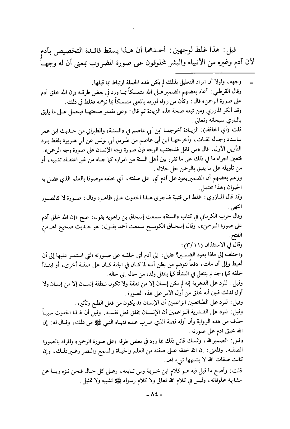 قيل: هَذَا غلط لوجهين: أحدهما: أن هَذَا يسقط فائدة التخصيص بآدم لأن آدم وغيره من الأنبياء والبشر مخلوقون عَلَى صورة المضروب بمعنى أن له وجها،