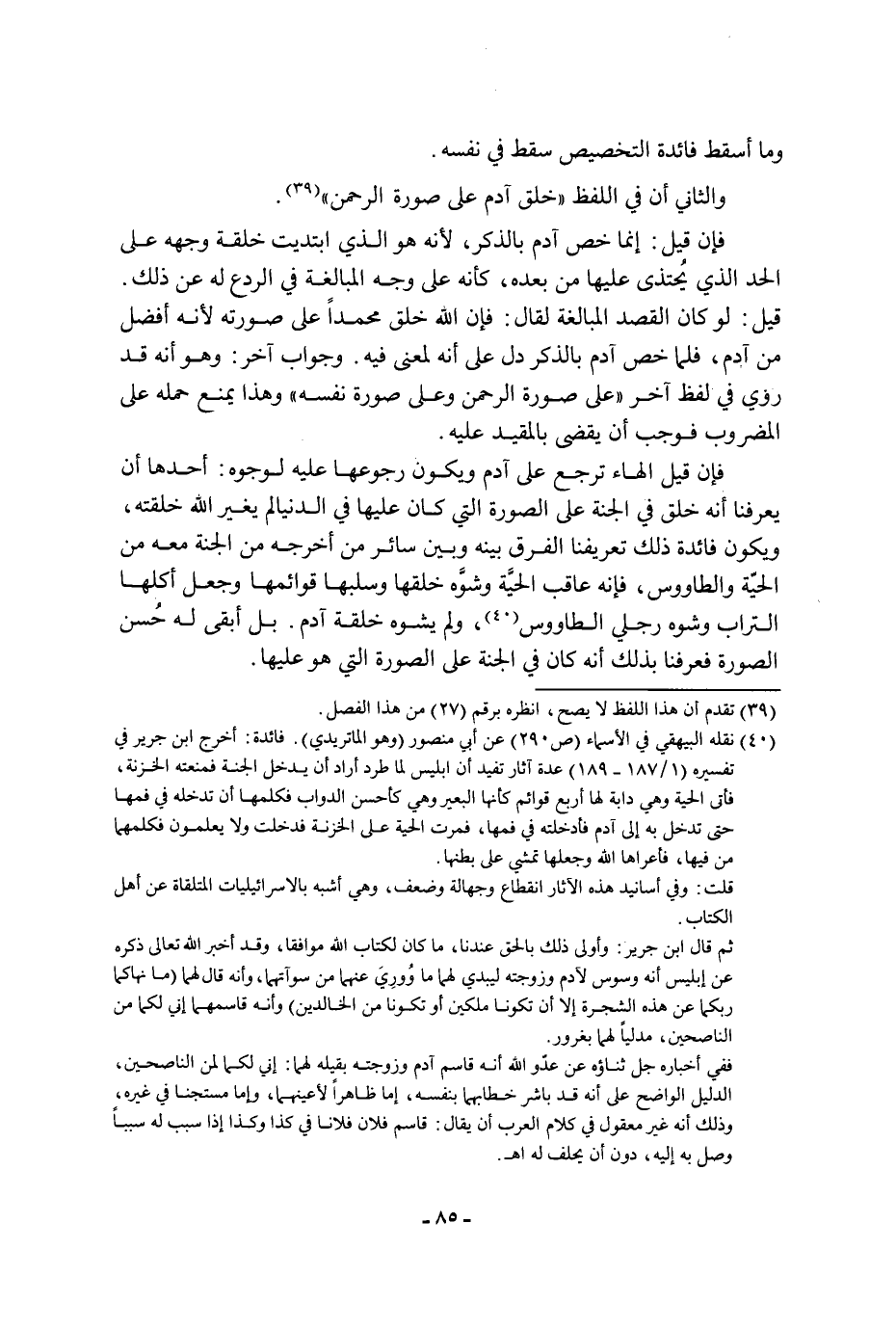 آدم بالذكر دل عَلَى أنه لمعنى فيه وجواب آخر: وهو أنه قد روي فِي لفظ آخر: " عَلَى صورة الرحمن وعلى صورة نفسه " وهذا يمنع حمله عَلَى المضروب فوجب أن يقضى بالمقيد عليه فإن قيل: الهاء ترجع عَلَى آدم ويكون رجوعها عليه لوجوه: أحدها: أن يعرفنا أنه خلق فِي الجنة عَلَى الصورة التي كان عليها فِي الدنيا لم يغير الله خلقته، ويكون فائدة ذَلِكَ تعريفنا الفرق بينه وبين سائر من أخرجه من الجنة معه من الحية والطاووس، فإنه عاقب الحية وشوه خلقها وسلبها قوائمها وجعل أكلها التراب وشوه رجلي الطاووس، ولم يشوه خلقة آدم بلى أبقى له حسن الصورة فعرفنا بذلك أنه كان فِي الجنة عَلَى الصورة التي هو عليها