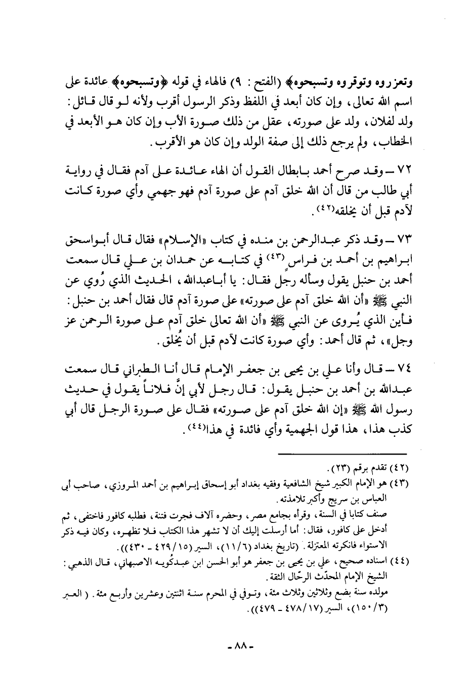 ٧٢ - وقد صرح أَحْمَد بإبطال القول أن الهاء عائدة عَلَى آدم، فقال فِي رواية أَبِي طالب: من قَالَ أن الله خلق آدم عَلَى صورة آدم فهو جهمي، وأي صورة كانت لآدم قبل أن يخلقه