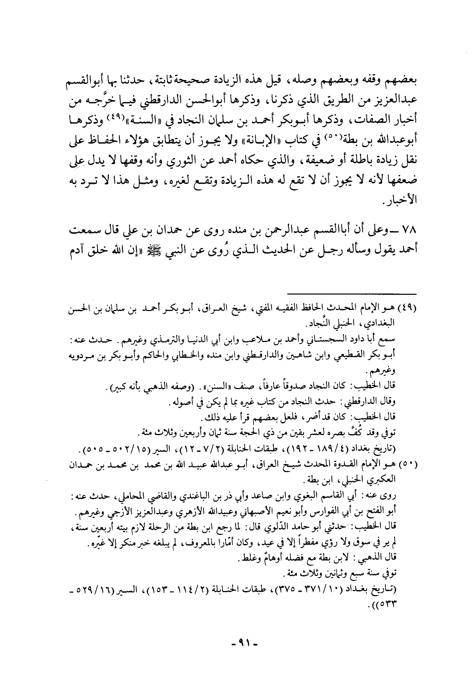 ٧٨ - وعلى أن أَبَا القسم عبد الرحمن بن منده روى عن حمدان بن علي، قَالَ: سمعت أَحْمَد يَقُول وسأله رجل عن الحديث الذي روي عن النبي، صَلَّى اللَّهُ عَلَيْهِ وَسَلَّمَ: " إن الله خلق آدم