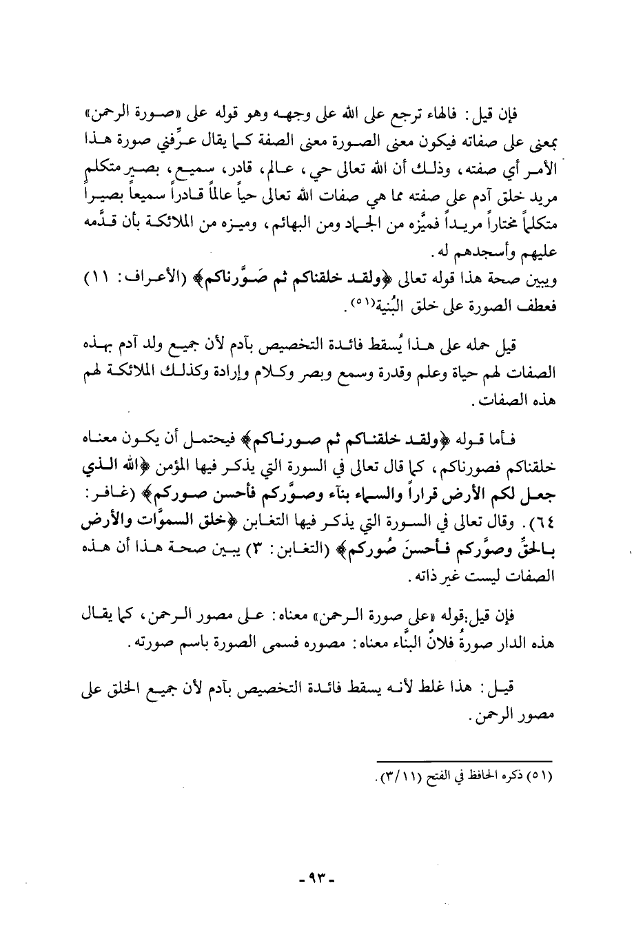 بصير متكلم مريد، خلق آدم عَلَى صفته مما هي صفات الله تَعَالَى حيا عالما قادرا سميعا بصيرا متكلما مختارا مريدا فميزه من الجهاد ومن البهائم، وميزه من الملائكة بأن قدمه عليهم وأسجدهم له ويبين صحة هَذَا قوله تَعَالَى: {وَلَقَدْ خَلَقْنَاكُمْ ثُمَّ صَوَّرْنَاكُمْ} فعطف الصورة عَلَى خلق البنية قيل: حمله عَلَى هَذَا يسقط فائدة التخصيص بآدم لأن جميع ولد آدم بهذه الصفات لهم حياة وعلم وقدرة وسمع وبصر وكلام وإرادة وكذلك الملائكة لهم هَذِهِ الصفات فأما قوله: {وَلَقَدْ خَلَقْنَاكُمْ ثُمَّ صَوَّرْنَاكُمْ} فيحتمل أن يكون معناه خلقناكم فصورناكم، كما قَالَ تَعَالَى فِي السورة التي يذكر فيها المؤمن: {اللَّهُ الَّذِي جَعَلَ لَكُمُ الأَرْضَ قَرَارًا وَالسَّمَاءَ بِنَاءً وَصَوَّرَكُمْ فَأَحْسَنَ صُوَرَكُمْ} وَقَالَ تَعَالَى فِي السورة التي يذكر فيها التغابن: {خَلَقَ السَّمَوَاتِ وَالأَرْضَ بِالْحَقِّ وَصَوَّرَكُمْ فَأَحْسَنَ صُوَرَكُمْ} يبين صحة هَذَا أن هَذِهِ الصفات ليست غير ذاته فإن قيل: قوله " عَلَى صورة الرحمن " معناه: عَلَى مصور الرحمن، كما يقال هَذِهِ الدار صورة فلان البناء معناه: مصوره فسمى الصورة باسم صورته قيل: هَذَا غلط لأنه يسقط فائدة التخصيص بآدم لأن جميع الخلق عَلَى مصور الرحمن