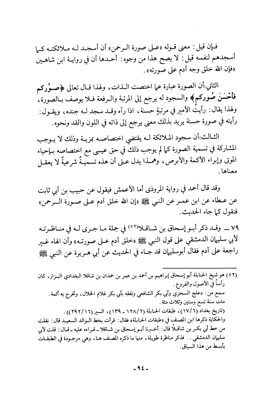 ٧٩ - وقد ذكر أَبُو إسحاق بن شاقلا فِي جملة ما جرى له فِي مناظرته لأبي سُلَيْمَان الدمشقي عَلَى قول النبي، صَلَّى اللَّهُ عَلَيْهِ وَسَلَّمَ: " خلق آدم عَلَى صورته " وأن الهاء غير راجعة عَلَى آدم، فقال أَبُو سُلَيْمَان: قد جاء فِي الحديث عن أَبِي هُرَيْرَةَ، عن النبي، صَلَّى اللَّهُ عَلَيْهِ وَسَلَّمَ.
