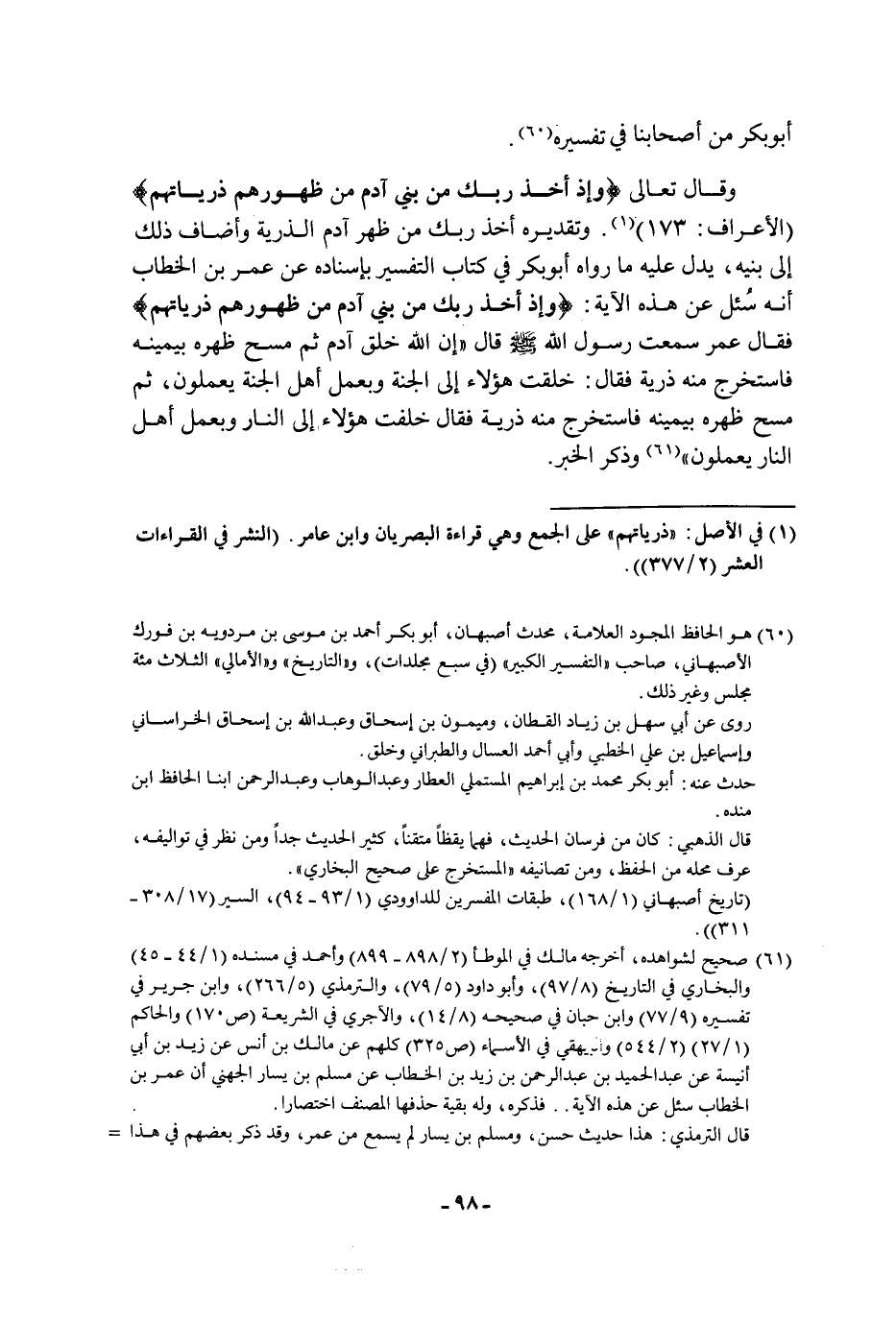 أَبُو بكر من أصحابنا فِي تفسيره وقال تَعَالَى: {وَإِذْ أَخَذَ رَبُّكَ مِنْ بَنِي آدَمَ مِنْ ظُهُورِهِمْ ذُرِّيَّتَهُمْ} وتقديره: أخذ ربك من ظهر آدم الذرية وأضاف ذَلِكَ إلى بنيه، يدل عليه ما رواه أَبُو بكر فِي كتاب التفسير بإسناده عن عمر بن الخطاب أنه سئل عن هَذِهِ الآية: {وَإِذْ أَخَذَ رَبُّكَ مِنْ بَنِي آدَمَ مِنْ ظُهُورِهِمْ ذُرِّيَّتَهُمْ} فقال عمر: سمعت رسول الله، صَلَّى اللَّهُ عَلَيْهِ وَسَلَّمَ، قَالَ: " إن الله خلق آدم ثم مسح ظهره بيمينه فاستخرج منه ذرية فقال: خلقت هَؤُلاءِ إلى الجنة وبعمل أهل الجنة يعملون، ثم مسح ظهره بيمينه فاستخرج منه ذرية، فقال: خلقت هَؤُلاءِ إلى النار وبعمل أهل النار يعملون " وذكر الخبر