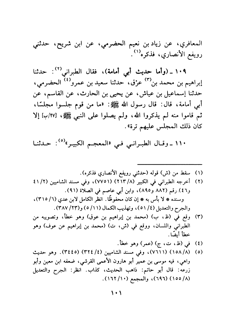 ١٠٩ - (وأما حديث أبي أمامة)، فقال الطبراني (¬٢): حدثنا إبراهيم بن محمد بن (¬٣) عرْق، حدثنا سعيد بن عمرو (¬٤) الحضرمي، حدثنا إسماعيل بن عياش، عن يحيي بن الحارث، عن القاسم، عن أبي أمامة، قال: قال رسول الله - صلى الله عليه وسلم -: "ما من قوم جلسوا مجلسًا، ثم قاموا منه لم يذكروا الله، ولم يصلوا علي النبي - صلى الله عليه وسلم -، إلا كان ذلك المجلس عليهم ترة".