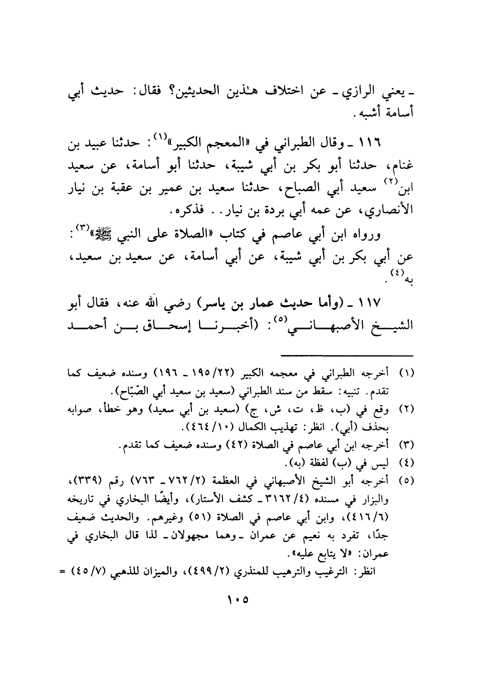 (¬٥) أخرجه أبو الشيخ الأصبهاني في العظمة (٢/ ٧٦٢ - ٧٦٣) رقم (٣٣٩)، والبزار في مسنده (٤/ ٣١٦٢ - كشف الأستار)، وأيضًا البخاري في تاريخه (٦/ ٤١٦)، وابن أبي عاصم في الصلاة (٥١) وغيرهم. والحديث ضعيف جدًا، تفرد به نعيم عن عمران -وهما مجهولان- لذا قال البخاري في عمران: "لا يتابع عليه".