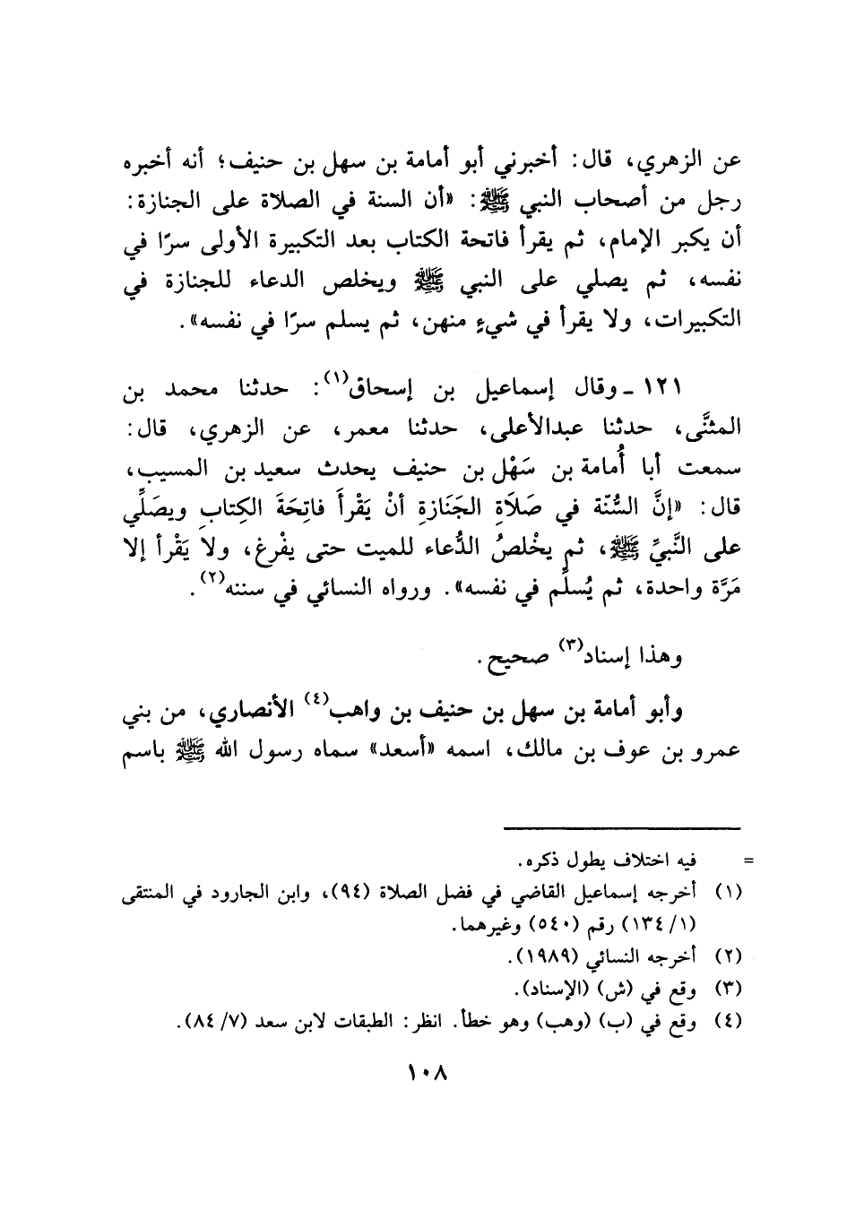 ١٢١ - وقال إسماعيل بن إسحاق (¬١): حدثنا محمد بن المثنَّي، حدثنا عبد الأعلي، حدثنا معمر، عن الزهري، قال: سمعت أبا أُمامة بن سَهْل بن حنيف يحدث سعيد بن المسيب، قال: "إنَّ السُّنّة في صَلَاةِ الجَنَازةِ أنْ يَقْرأَ فاتِحَةَ الكِتاب ويصَلِّي علي النَّبيِّ - صلى الله عليه وسلم -، ثم يخْلصُ الدُّعاء للميت حتي يفْرغ، ولَا يَقْرأ إلا مَرَّة واحدة، ثم يُسلِّم في نفسه". ورواه النسائي في سننه (¬٢).