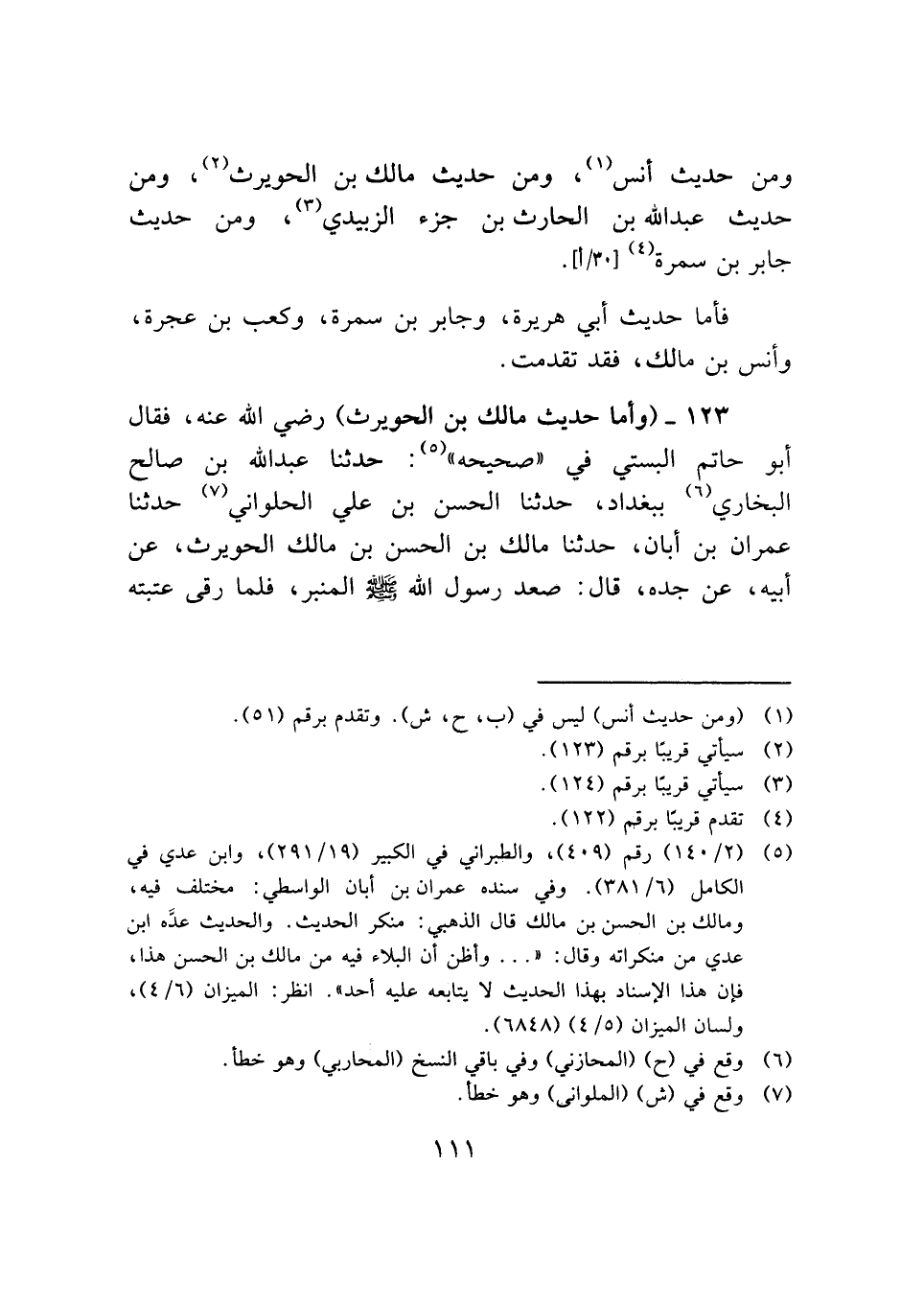 ١٢٣ - (وأما حديث مالك بن الحويرث) رضي الله عنه، فقال أبو حاتم البستي في "صحيحه" (¬٥): حدثنا عبد الله بن صالح البخاري (¬٦) ببغداد، حدثنا الحسن بن علي الحلواني (¬٧) حدثنا عمران بن أبان، حدثنا مالك بن الحسن بن مالك الحويرث، عن أبيه، عن جده، قال: صعد رسول الله - صلى الله عليه وسلم - المنبر، فلما رقي عتبته