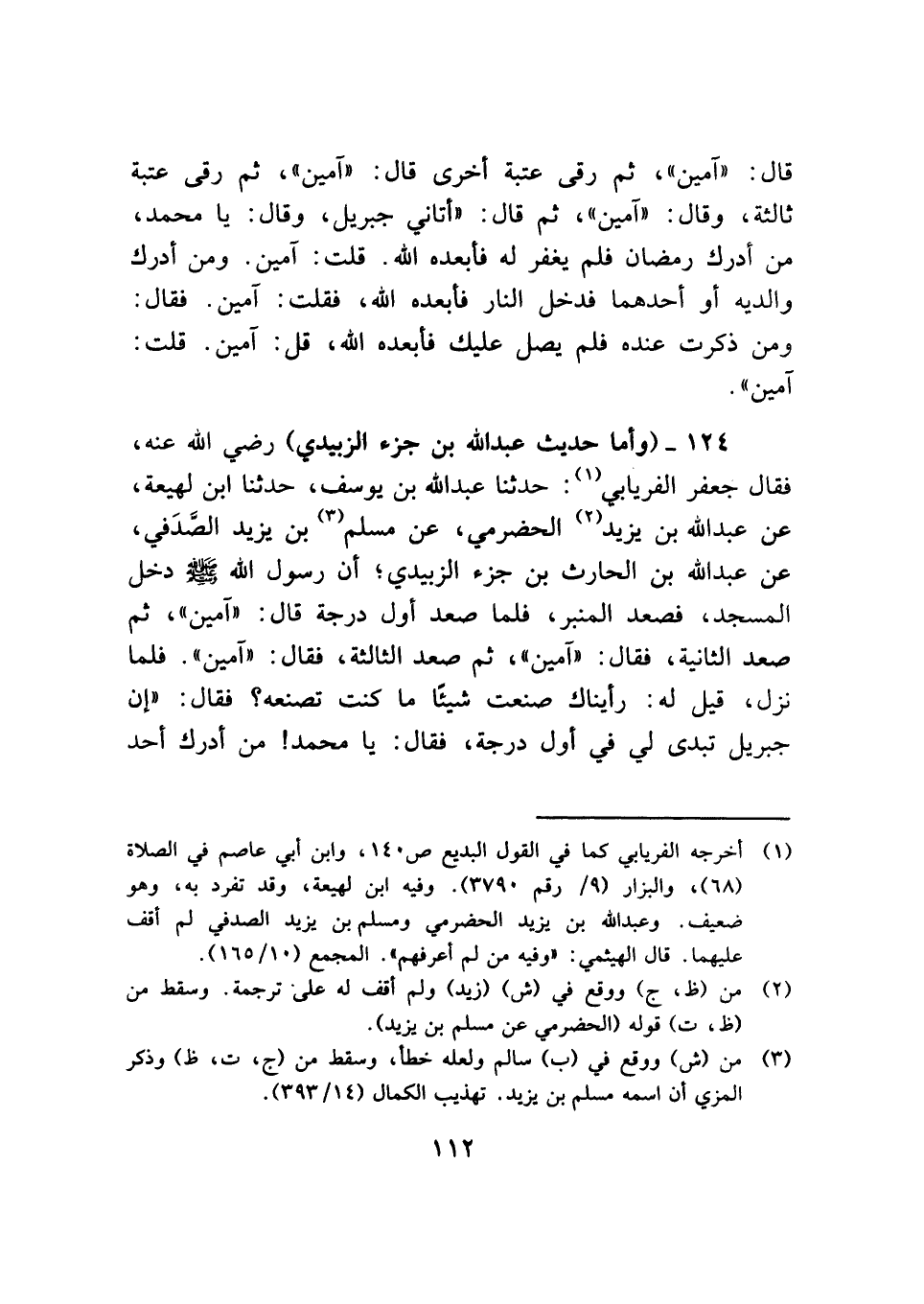 ١٢٤ - (وأما حديث عبد الله بن جزء الزبيدي) رضي الله عنه، فقال جعفر الفريابي (¬١). حدثنا عبد الله بن يوسف، حدثنا ابن لهيعة، عن عبد الله بن يزيد (¬٢) الحضرمي، عن مسلم (¬٣) بن يزيد الصَّدَفي، عن عبد الله بن الحارث بن جزء الزبيدي؛ أن رسول الله - صلى الله عليه وسلم - دخل المسجد، فصعد المنبر، فلما صعد أول درجة قال: "آمين"، ثم صعد الثانية، فقال: "آمين"، ثم صعد الثالثة، فقال: "آمين". فلما نزل، قيل له: رأيناك صنعت شيئًا ما كنت تصنعه؟ فقال: "إن جبريل تبدي لي في أول درجة، فقال: يا محمد! من أدرك أحد