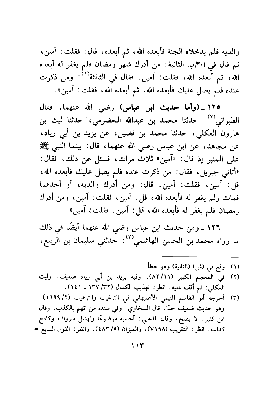 ١٢٥ - (وأما حديث ابن عباس) رضي الله عنهما، فقال الطبراني (¬٢): حدثنا محمد بن عبد الله الحضرمي، حدثنا ليث بن هارون العكلي، حدثنا محمد بن فضيل، عن يزيد بن أبي زياد، عن مجاهد، عن ابن عباس رضي الله عنهما، قال: بينما النبي - صلى الله عليه وسلم - علي المنبر إذ قال: "آمين" ثلاث مرات، فسئل عن ذلك، فقال: "أتاني جبريل، فقال: من ذكرت عنده فلم يصل عليك فأبعده الله، قل: آمين، فقلت: آمين. قال: ومن أدرك والديه، أو أحدهما فمات ولم يغفر له فأبعده الله، قل: آمين، فقلت: آمين، ومن أدرك رمضان فلم يغفر له فأبعده الله، قل: آمين. فقلت: آمين".