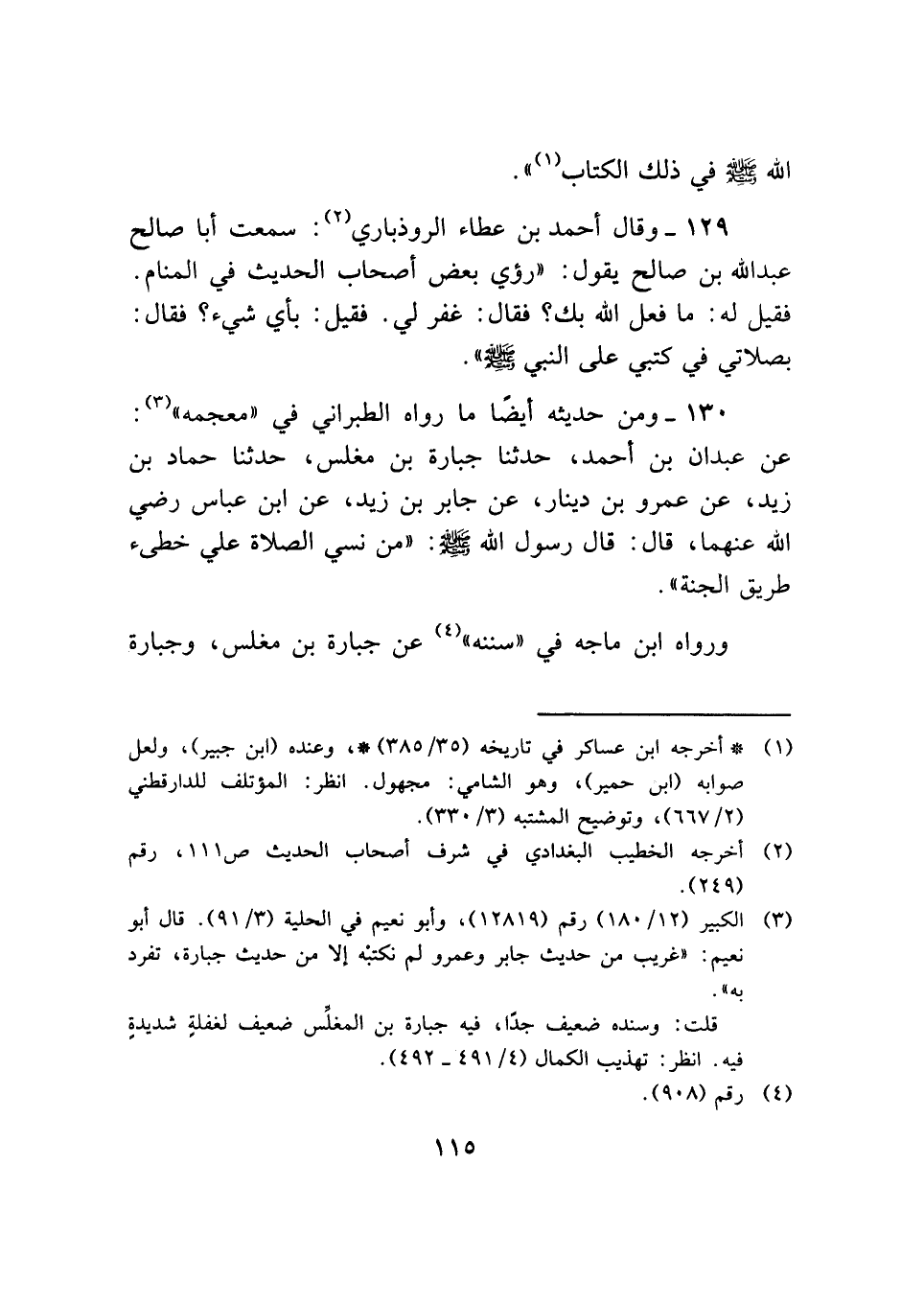 ١٢٩ - وقال أحمد بن عطاء الروذباري (¬٢): سمعت أبا صالح عبد الله بن صالح يقول: "رؤي بعض أصحاب الحديث في المنام. فقيل له: ما فعل الله بك؟ فقال: غفر لي. فقيل: بأي شيء؟ فقال: بصلاتي في كتبي علي النبي - صلى الله عليه وسلم -".