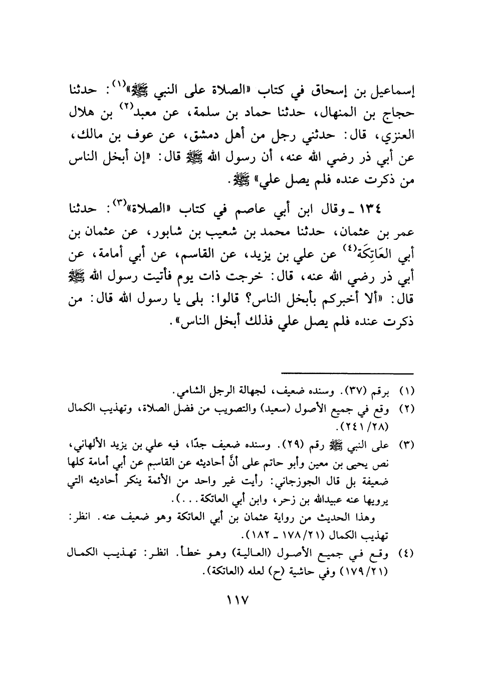 ١٣٤ - وقال ابن أبي عاصم في كتاب "الصلاة" (¬٣): حدثنا عمر بن عثمان، حدثنا محمد بن شعيب بن شابور، عن عثمان بن أبي العَاتِكَة (¬٤) عن علي بن يزيد، عن القاسم، عن أبي أمامة، عن أبي ذر رضي الله عنه، قال: خرجت ذات يوم فأتيت رسول الله - صلى الله عليه وسلم - قال: "ألا أخبركم بأبخل الناس؟ قالوا: بلي يا رسول الله قال: من ذكرت عنده فلم يصل علي فذلك أبخل الناس".