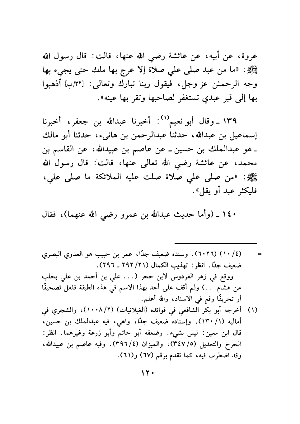 ١٣٩ - وقال أبو نعيم (¬١): أخبرنا عبد الله بن جعفر، أخبرنا إسماعيل بن عبد الله، حدثنا عبد الرحمن بن هانيء، حدثنا أبو مالك -هو عبد الملك بن حسين- عن عاصم بن عبيد الله، عن القاسم بن محمد، عن عائشة رضي الله تعالي عنها، قالت: قال رسول الله - صلى الله عليه وسلم -: "من صلي علي صلاة صلت عليه الملائكة ما صلي علي، فليكثر عبد أو يقل".