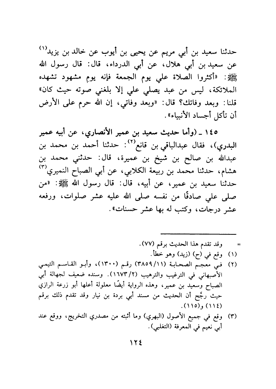 ١٤٥ - (وأما حديث سعيد بن عمير الأنصاري، عن أبيه عمير البدري)، فقال عبد الباقي بن قانع (¬٢): حدثنا أحمد بن محمد بن عبد الله بن صالح بن شيخ بن عميرة، قال: حدثني محمد بن هشام، حدثنا محمد بن ربيعة الكلابي، عن أبي الصباح النميري (¬٣) حدثنا سعيد بن عمير، عن أبيه، قال: قال رسول الله - صلى الله عليه وسلم -: "من صلي علي صادقًا من نفسه صلي الله عليه عشر صلوات، ورفعه عشر درجات، وكتب له بها عشر حسنات".
