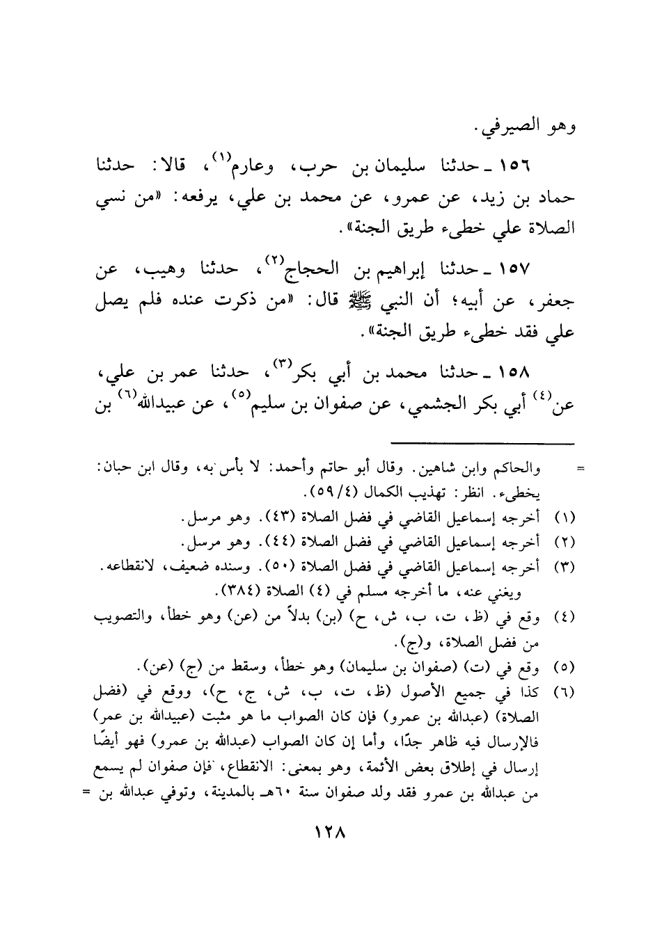 (¬٦) كذا في جميع الأصول (ظ، ت، ب، ش، ج، ح)، ووقع في (فضل الصلاة) (عبد الله بن عمرو) فإن كان الصواب ما هو مثبت (عبيد الله بن عمر) فالإرسال فيه ظاهر جدًا، وأما إن كان الصواب (عبد الله بن عمرو) فهو أيضًا إرسال في إطلاق بعض الأئمة، وهو بمعني: الانقطاع، فإن صفوان لم يسمع من عبد الله بن عمرو فقد ولد صفوان سنة ٦٠ هـ بالمدينة، وتوفي عبد الله بن =