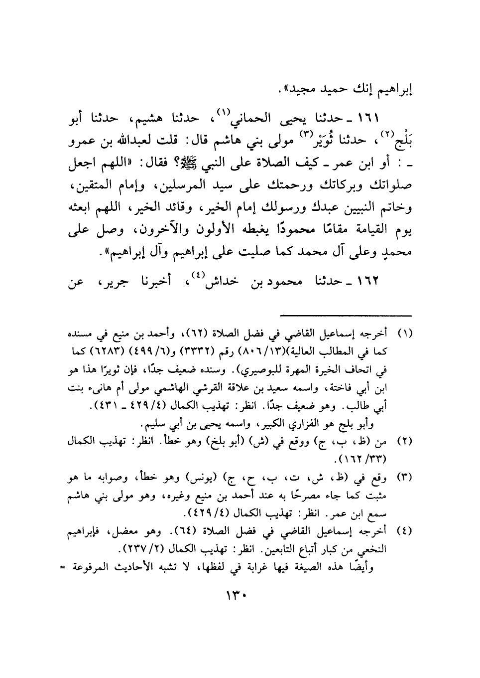 ١٦١ - حدثنا يحيي الحماني (¬١)، حدثنا هشيم، حدثنا أبو بَلْج (¬٢)، حدثنا ثُوَيْر (¬٣) مولي بني هاشم قال: قلت لعبد الله بن عمرو -: أو ابن عمر- كيف الصلاة علي النبي - صلى الله عليه وسلم -؟ فقال: "اللهم اجعل صلواتك وبركاتك ورحمتك علي سيد المرسلين، وإمام المتقين، وخاتم النبيين عبدك ورسولك إمام الخير، وقائد الخير، اللهم ابعثه يوم القيامة مقامًا محمودًا يغبطه الأولون والآخرون، وصل علي محمدٍ وعلي آل محمد كما صليت علي إبراهيم وآل إبراهيم".