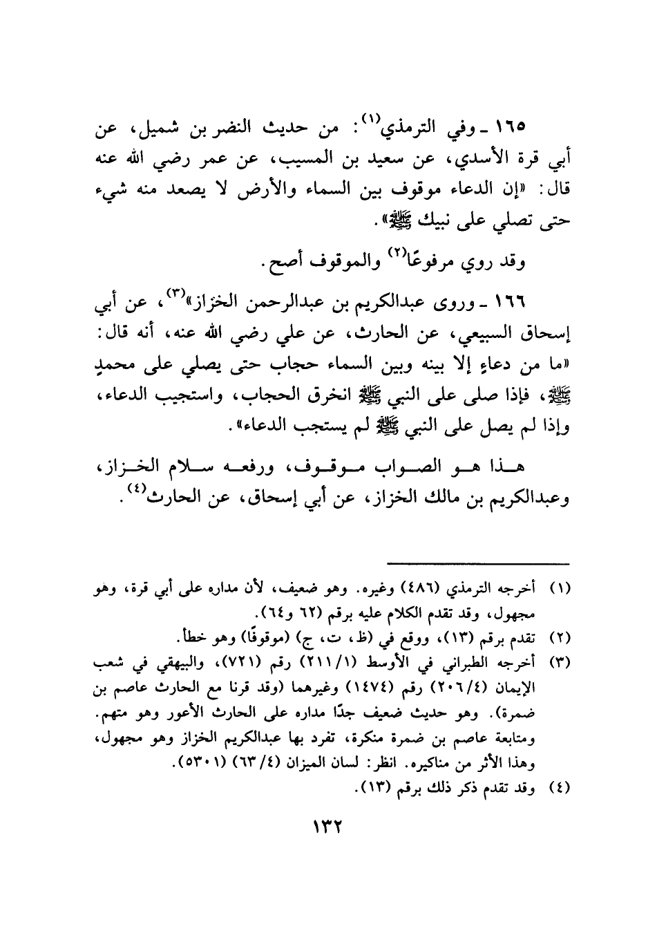 ١٦٥ - وفي الترمذي (¬١). من حديث النضر بن شميل، عن أبي قرة الأسدي، عن سعيد بن المسيب، عن عمر رضي الله عنه قال: "إن الدعاء موقوف بين السماء والأرض لا يصعد منه شيء حتي تصلي علي نبيك - صلى الله عليه وسلم -".