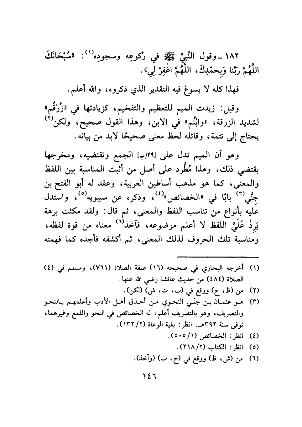 (¬٣) هو عثمان بن جنّي النحوي من أحذق أهل الأدب وأعلمهم بالنحو والتصريف، وهو بالتصريف أعلم، له الخصائص في النحو واللمع وغيرهما، توفي سنة ٣٩٢ هـ. انظر: بغية الوعاة (٢/ ١٣٢).