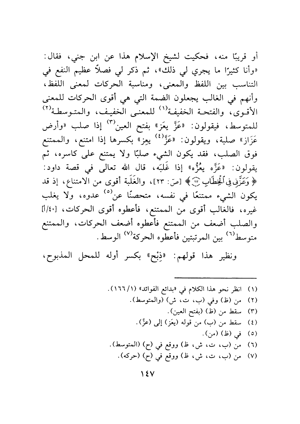 أو قريبًا منه، فحكيت لشيخ الإسلام هذا عن ابن جني، فقال: "وأنا كثيرًا ما يجري لي ذلك"، ثم ذكر لي فصلًا عظيم النفع في التناسب بين اللفظ والمعنى، ومناسبة الحركات لمعنى اللفظ، وأنهم في الغالب يجعلون الضمة التي هي أقوى الحركات للمعنى الأقوى، والفتحة الخفيفة (¬١) للمعنى الخفيف، والمتوسطة (¬٢) للمتوسط، فيقولون: "عَزَّ يعَز" بفتح العين (¬٣) إذا صلب "وأرض عَزاز" صلبة، ويقولون: "عَزَّ (¬٤) يعِز" بكسرها إذا امتنع، والممتنع فوق الصلب، فقد يكون الشيء صلبًا ولا يمتنع على كاسره، ثم يقولون: "عَزَّه يعُزُّه" إذا غَلبَه، قال الله تعالى في قصة داود: {وَعَزَّنِي فِي الْخِطَابِ (٢٣)} [ص: ٢٣]، والغَلَبة أقوى من الامتناع، إذ قد يكون الشيء ممتنعًا في نفسه، متحصنًا عن (¬٥) عدوه، ولا يغلب غيره، فالغالب أقوى من الممتنع، فأعطوه أقوى الحركات، والصلب أضعف من الممتنع فأعطوه أضعف الحركات، والممتنع متوسط (¬٦) بين المرتبتين فأعطوه الحركة (¬٧) الوسط.