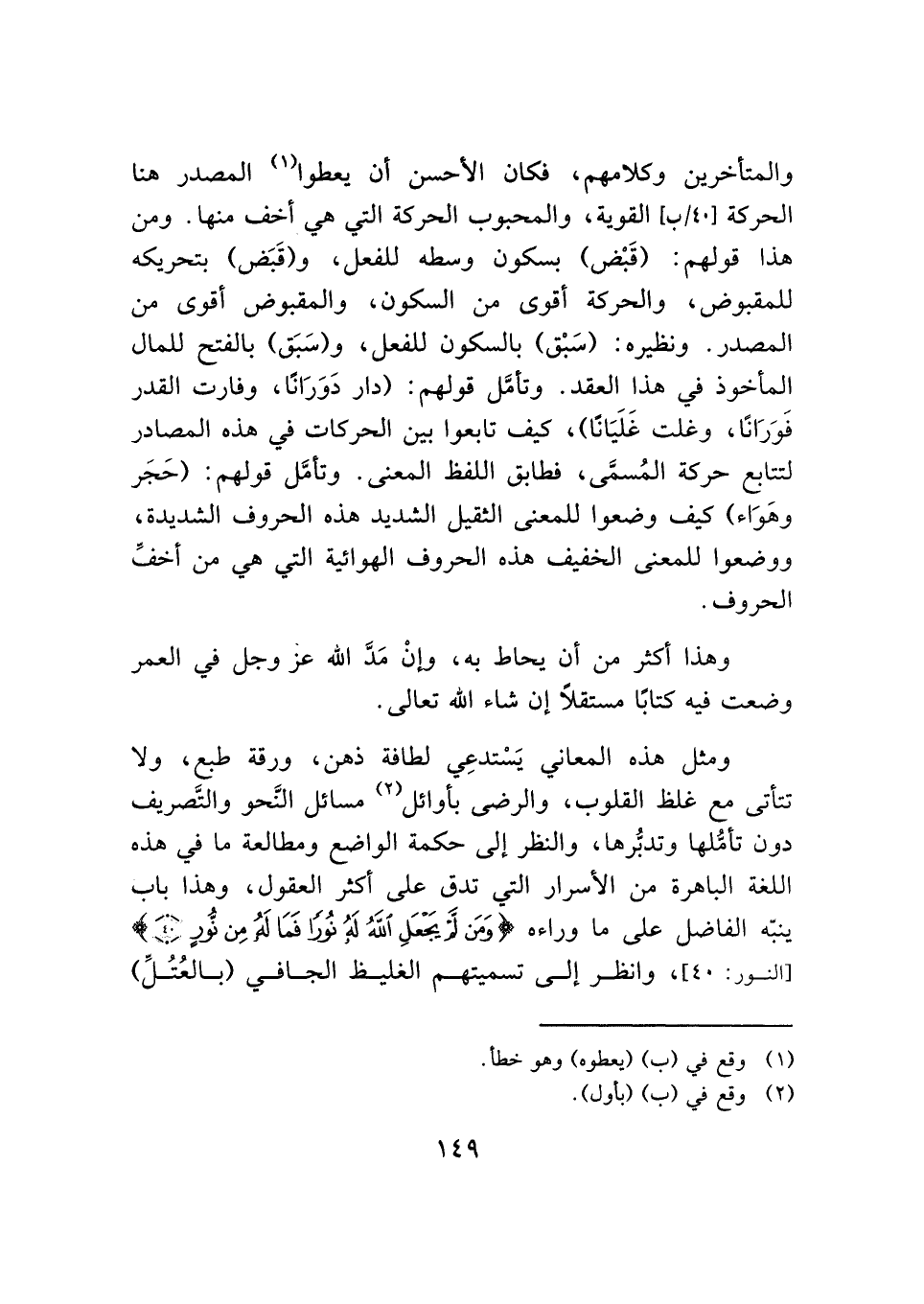 والمتأخرين وكلامهم، فكان الأحسن أن يعطوا (¬١) المصدر هنا الحركة القوية، والمحبوب الحركة التي هي أخف منها. ومن هذا قولهم: (قَبْض) بسكون وسطه للفعل، و (قَبَض) بتحريكه للمقبوض، والحركة أقوى من السكون، والمقبوض أقوى من المصدر. ونظيره: (سَبْق) بالسكون للفعل، و (سَبَق) بالفتح للمال المأخوذ في هذا العقد. وتأمَّل قولهم: (دار دَوَرانًا، وفارت القدر فَوَرانًا، وغلت غَلَيانًا)، كيف تابعوا بين الحركات في هذه المصادر لتتابع حركة المُسمَّى، فطابق اللفظ المعنى. وتأمَّل قولهم: (حَجَر وهَواء) كيف وضعوا للمعنى الثقيل الشديد هذه الحروف الشديدة، ووضعوا للمعنى الخفيف هذه الحروف الهوائية التي هي من أخفِّ الحروف.
