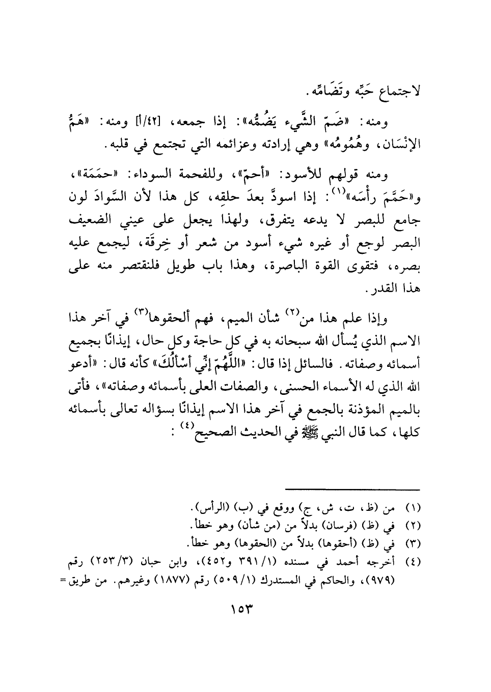 ومنه قولهم للأسود: "أحمّ"، وللفحمة السوداء: "حمَمَة"، و "حَمَّمَ رأْسَه" (¬١): إذا اسودَّ بعدَ حلقِه، كل هذا لأن السَّوادَ لون جامع للبصر لا يدعه يتفرق، ولهذا يجعل على عيني الضعيف البصر لوجع أو غيره شيء أسود من شعر أو خِرقَة، ليجمع عليه بصره، فتقوى القوة الباصرة، وهذا باب طويل فلنقتصر منه على هذا القدر.