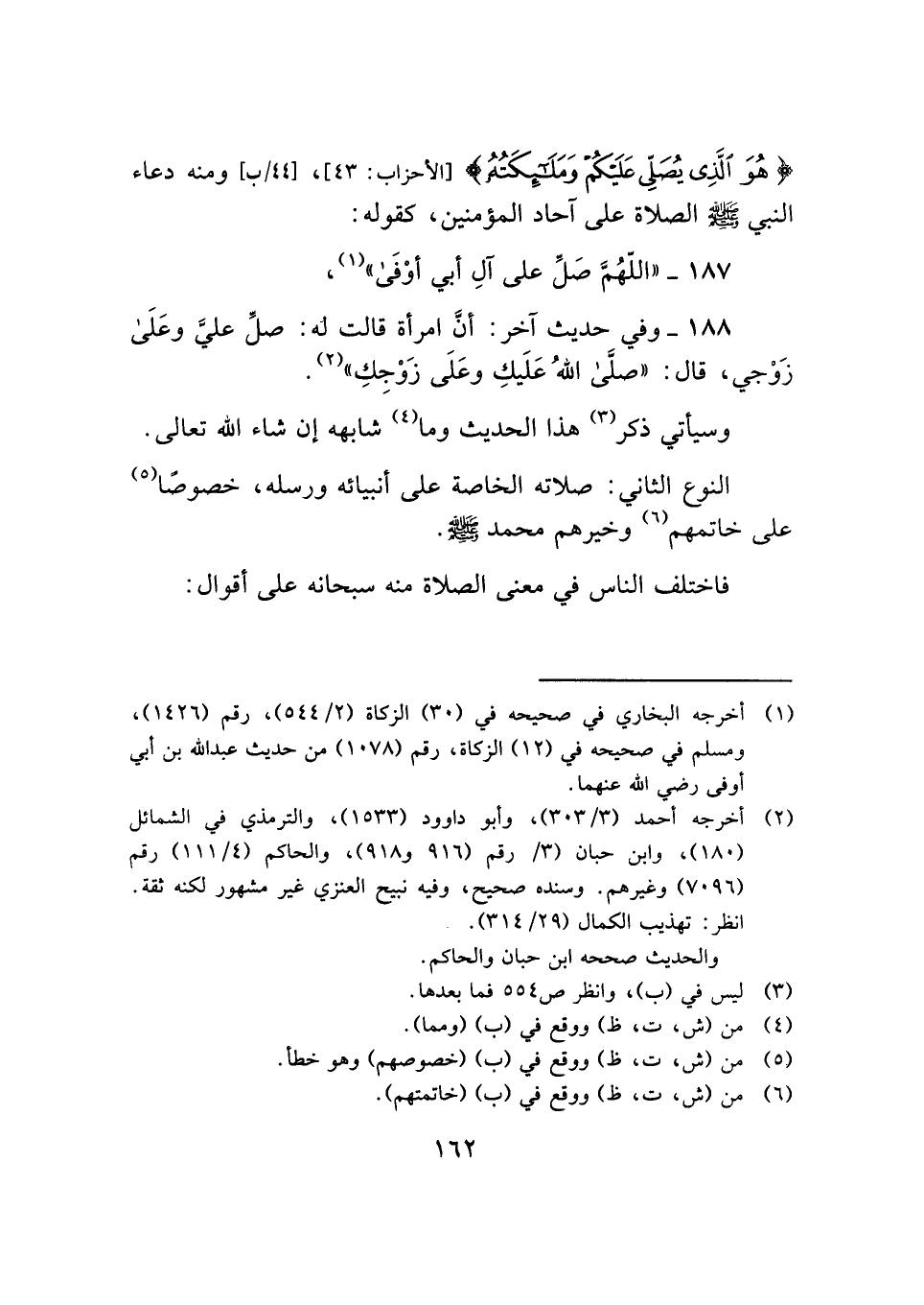 {هُوَ الَّذِي يُصَلِّي عَلَيْكُمْ وَمَلَائِكَتُهُ} [الأحزاب: ٤٣]، ومنه دعاء النبي -صلى الله عليه وسلم- الصلاة على آحاد المؤمنين، كقوله:
