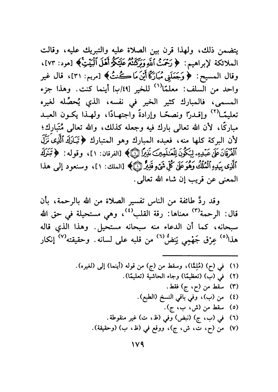 يتضمن ذلك، ولهذا قرن بين الصلاة عليه والتبريك عليه، وقالت الملائكة لإبراهيم: {رَحْمَتُ اللَّهِ وَبَرَكَاتُهُ عَلَيْكُمْ أَهْلَ الْبَيْتِ} [هود: ٧٣]، وقال المسيح: {وَجَعَلَنِي مُبَارَكًا أَيْنَ مَا كُنْتُ} [مريم: ٣١]، قال غير واحد من السلف: معلمًا (¬١) للخير أينما كنت. وهذا جزء المسمى، فالمبارك كثير الخير في نفسه، الذي يُحصِّله لغيره تعليمًا (¬٢) وإقدرًا ونصحًا وإرادةً واجتهادًا، ولهذا يكون العبد مباركًا، لأن الله تعالى بارك فيه وجعله كذلك، والله تعالى مُتَبارِك؛ لأن البركة كلها منه، فعبده المبارك وهو المتبارك {تَبَارَكَ الَّذِي نَزَّلَ الْفُرْقَانَ عَلَى عَبْدِهِ لِيَكُونَ لِلْعَالَمِينَ نَذِيرًا (١)} [الفرقان: ١]، وقوله: {تَبَارَكَ الَّذِي بِيَدِهِ الْمُلْكُ وَهُوَ عَلَى كُلِّ شَيْءٍ قَدِيرٌ (١)} [الملك: ١]، وسنعود إلى هذا المعنى عن قريب إن شاء الله تعالى.