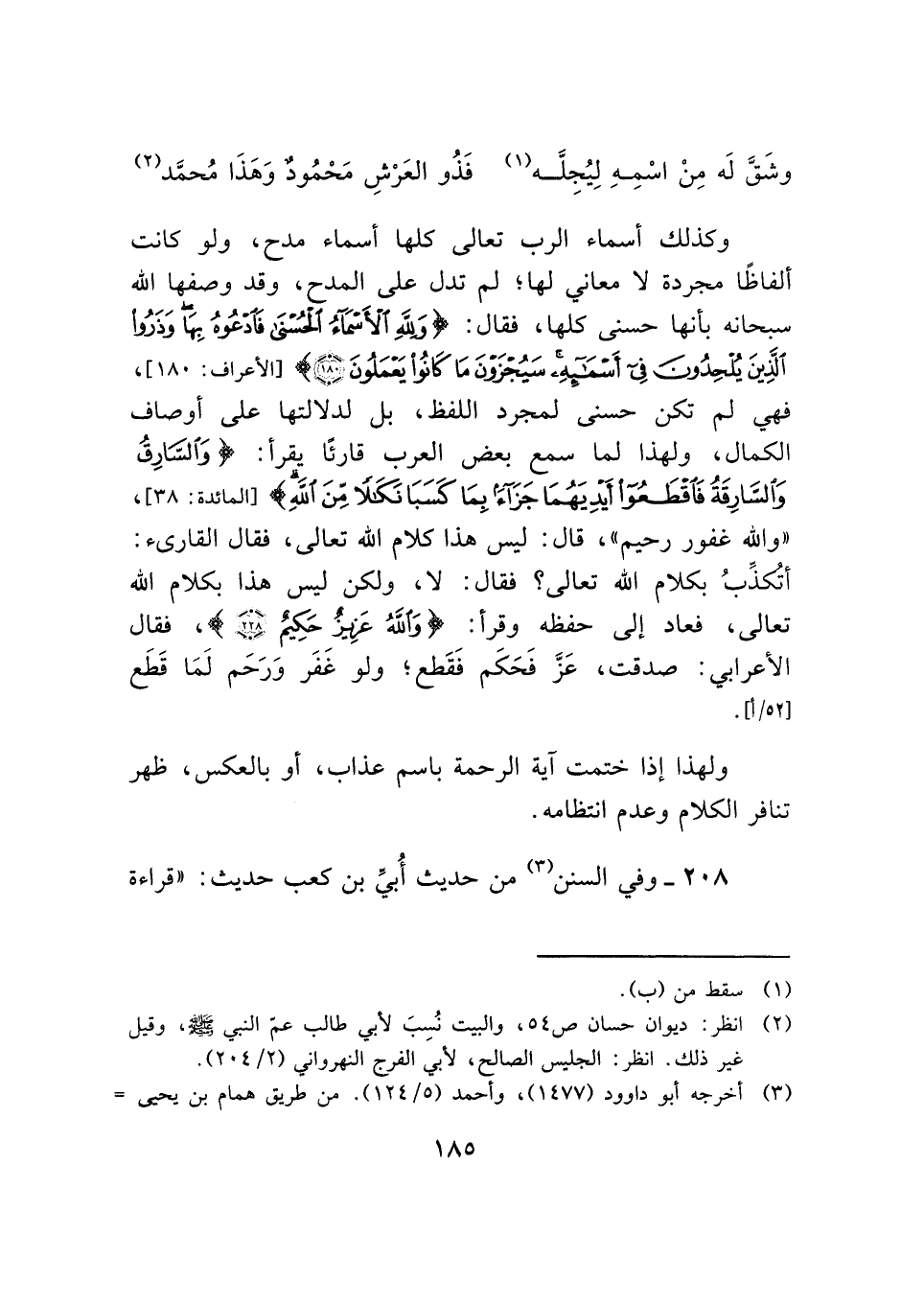 وكذلك أسماء الرب تعالى كلها أسماء مدح، ولو كانت ألفاظًا مجردة لا معاني لها؛ لم تدل على المدح، وقد وصفها الله سبحانه بأنها حسنى كلها، فقال: {وَلِلَّهِ الْأَسْمَاءُ الْحُسْنَى فَادْعُوهُ بِهَا وَذَرُوا الَّذِينَ يُلْحِدُونَ فِي أَسْمَائِهِ سَيُجْزَوْنَ مَا كَانُوا يَعْمَلُونَ (١٨٠)} [الأعراف: ١٨٠]، فهي لم تكن حسنى لمجرد اللفظ، بل لدلالتها على أوصاف الكمال، ولهذا لما سمع بعض العرب قارئًا يقرأ: {وَالسَّارِقُ وَالسَّارِقَةُ فَاقْطَعُوا أَيْدِيَهُمَا جَزَاءً بِمَا كَسَبَا نَكَالًا مِنَ اللَّهِ} [المائدة: ٣٨]، "والله غفور رحيم"، قال: ليس هذا كلام الله تعالى، فقال القارئ: أتكذِّبُ بكلام الله تعالى؟ فقال: لا، ولكن ليس هذا بكلام الله تعالى، فعاد إلى حفظه وقرأ: {وَاللَّهُ عَزِيزٌ حَكِيمٌ (٣٨)}، فقال الأعرابي: صدقت، عَزَّ فَحَكَم فَقَطع؛ ولو غَفَر وَرَحَم لَما قَطَع.