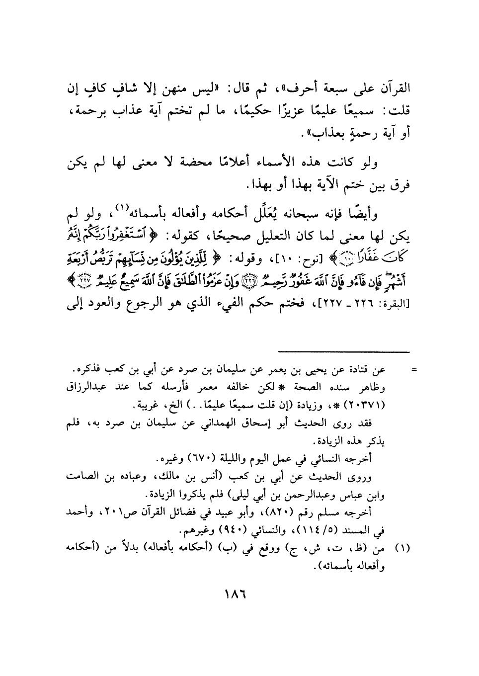القرآن على سبعة أحرف"، ثم قال: "ليس منهن إلا شافٍ كافٍ إن قلت: سميعًا عليمًا عزيزًا حكيمًا، ما لم تختم آية عذاب برحمة، أو آية رحمةٍ بعذاب".